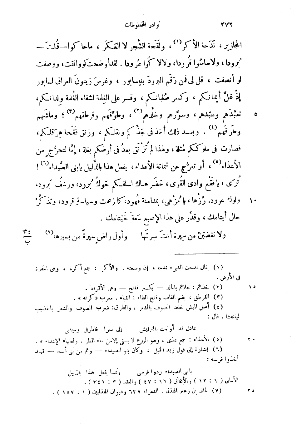 المجازير، ندحة الأكر، ولقحة الشجر لا العكر، ما حاكوا قلت برودا، ولا ساسوا قروداً، ولا لاكوا عروداً. لقد أوضحت لو وافقت، ووصفت لو أنصفت، قل لي فمن رقم البرود بنيسابور، وغرس زيتون العراق لسابور إذ غل أيمانكم، وكسر صلبانكم، وقسر على الغلمة لشفاء الغلمة ولدانكم، تعبدهم وعبدهم، وسورهم وخلدهم، وطوقهم وقرطهم، وماشهم وطرقهم. وبعد ذلك أخذ في جذكم ونقلكم، وزنق فقحة هرقلكم، فصارت في ملوككم مثلة، ولهذا لم تزنق بعد في أرضكم بغلة، إما لتحرّج من الأعذاء، أو تعرج عن شماتة الأعداء، يفعل هذا بالذليل يا بني الصيداء! ترى، يا فقع وادي القرى، حضر هناك لسلفكم حوك برود، ورشف برود، ولوك عرود. رزها، يا مزهي، بمدامنة فهود، كما زعمت وسياسة قرود، وتذكر حال أيتامك، وقدر على هذا الإصبع سعة خيتامك.