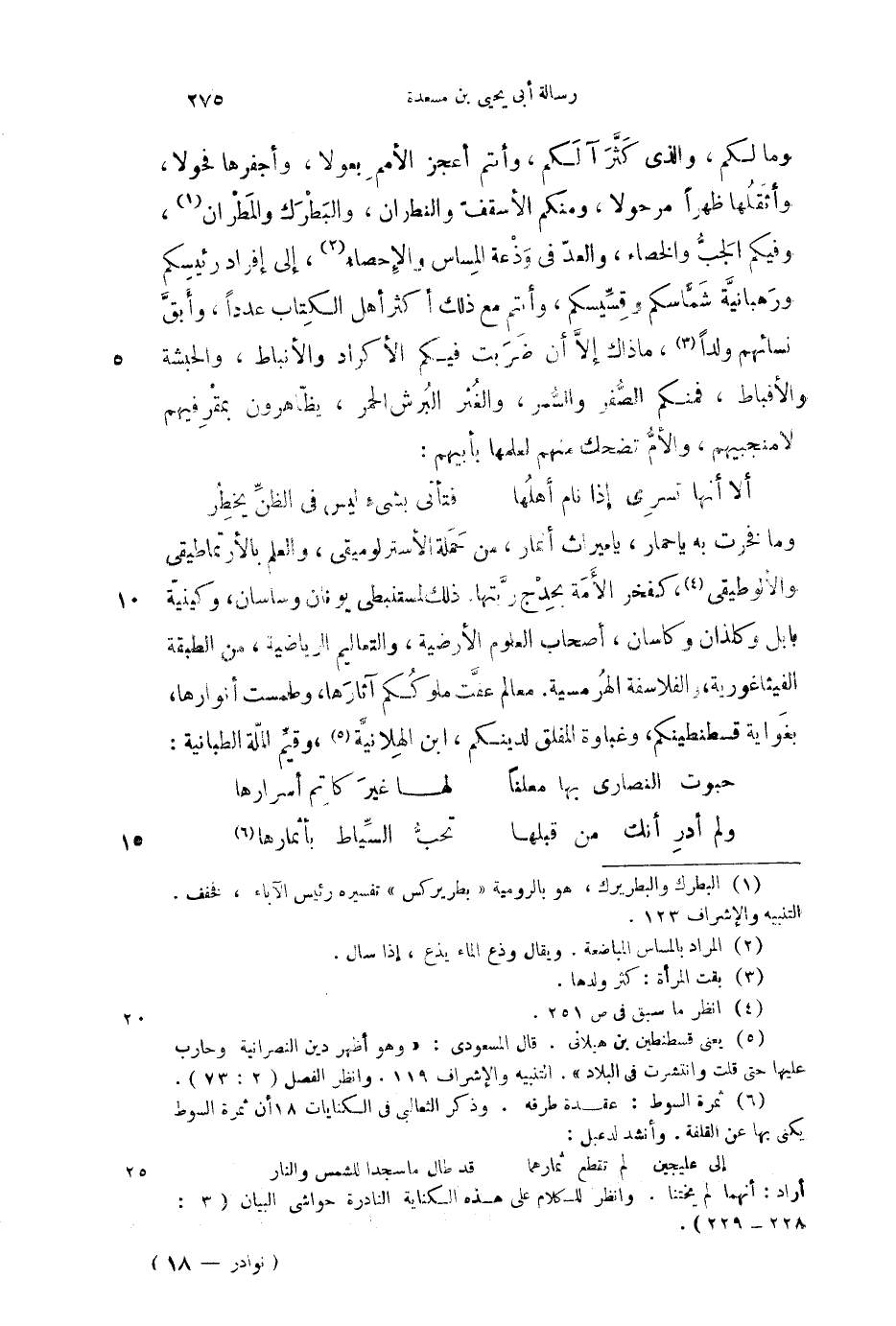 وما فخرت به يا حمار، يا ميراث أنمار، من حملة الأسترلوميقي، والعلم بالأرتماطيقي والألوطيقي، كفخر الأمة بحدج ربتها. ذلك لمستنبطي يونان وساسان، وكينية بابل وكلذان وكاسان، أصحاب العلوم الأرضية، والتعاليم الرياضية، من الطبقة الفيثاغورية، والفلاسفة الهرمسية. معالم عفّت ملوككم آثارها، وطمست أنوارها، بغواية قسطنطينكم، وغباوة المفلق لدينكم، ابن الهلانية، وقيم الملة الطبانية: