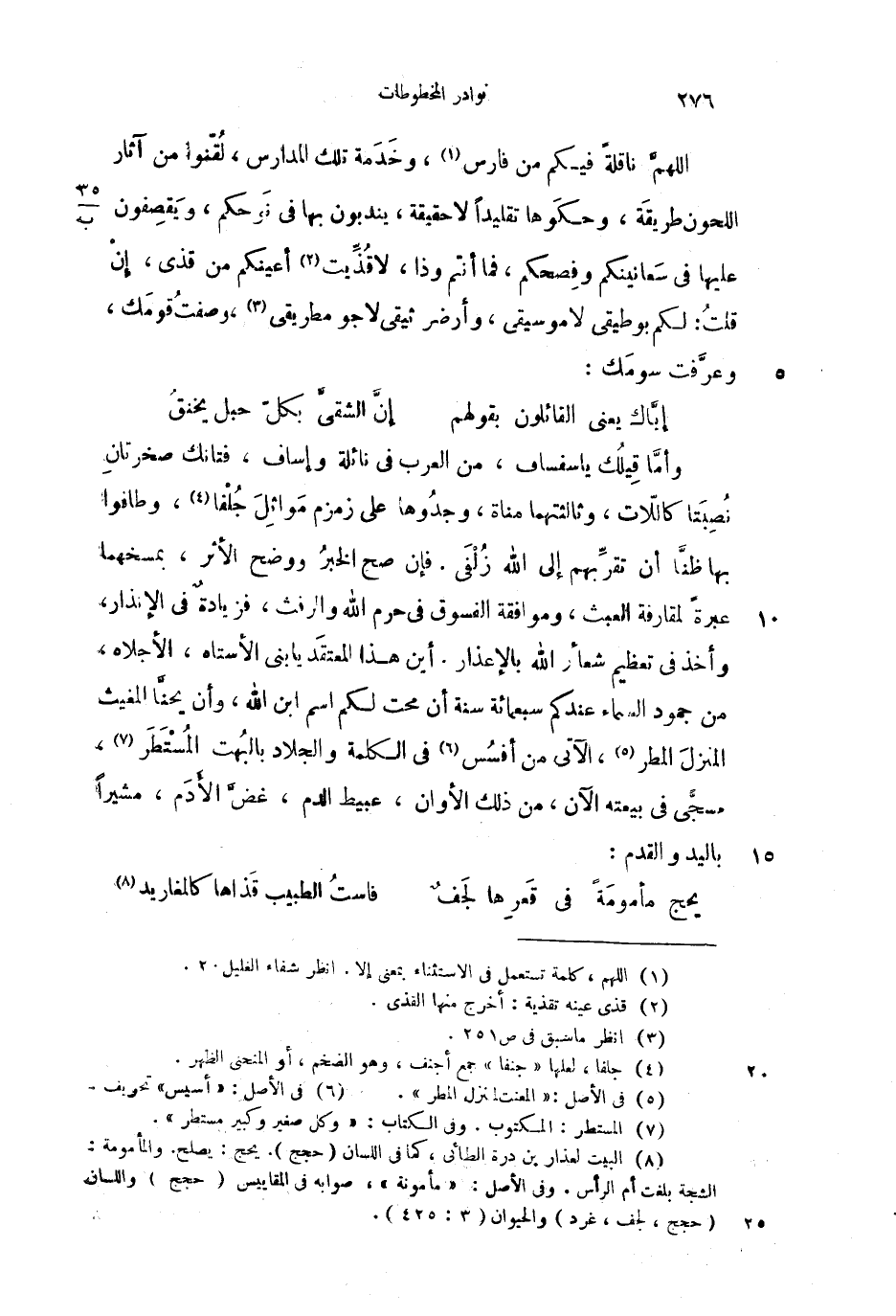 اللهم ناقلة فيكم من فارس، وخدمة تلك المدارس، لقنوا من آثار اللحون طريقة، وحطوها تقليداً لا حقيقة، يندبون بها في نوحكم، ويقصفون عليها في سعانينكم وفصحكم، فما أنتم وذا، لاقذيت أعينكم من قذى، إن قلت: لكم بوطيقي لا موسيقى، وأرضى ثيقي لا جو مطريقي، وصفت قومك، وعرفت سومك: