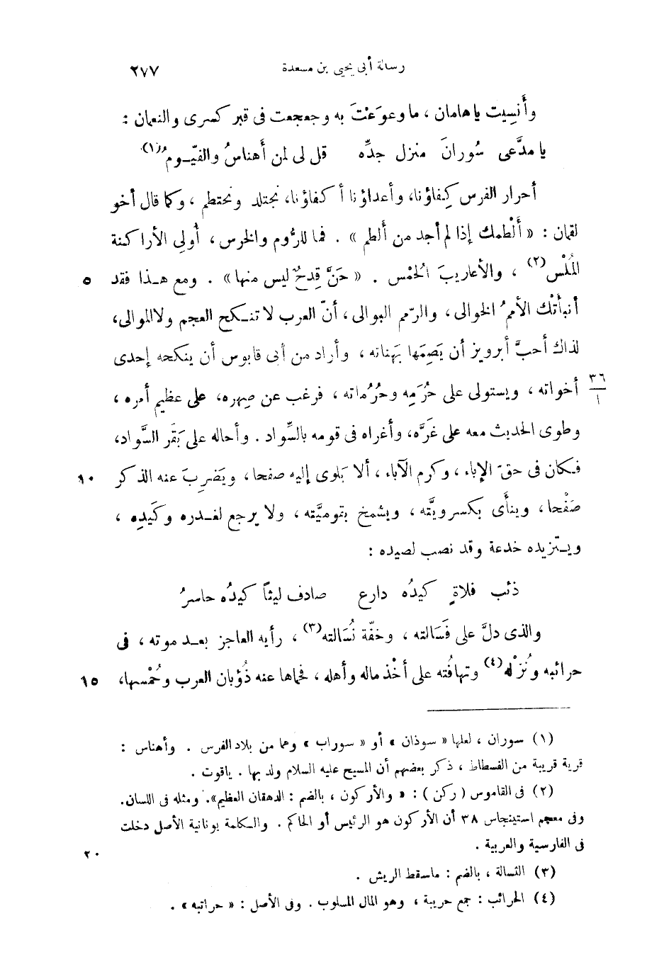 أحرار الفرس كفاؤنا، وأعداؤنا أكفاؤنا، نجتلد ونحتطم، وكما قال أخو لقمان: "ألطمك إذا لم أجد من ألطم". فما للروم والخرس، أولى الأراكنة الملس، والأعاريب الحمس. "حن قدحٌ ليس منها". ومع هذا فقد أنبأتك الأمم الخوالي، والرمم البوالي، أن العرب لا تنكح العجم ولا الموالي، لذلك أحب أبرويز أن يصمها بهناته، وأراد من أبي قابوس أن ينكحه إحدى أخواته، ويستولي على حرمه وحرماته، فرغب عن صهره، على عظيم أمره، وطوى الحديث معه على غره، وأغراه في قومه بالسواد. وأحاله على بقر السواد، فكان في حق الإباء، وكرم الآباء، ألا يلوي إليه صفحاً، ويضرب عنه الذكر صفحاً، وينأى بكسرويته، ويشمخ بقوميته، ولا يرجع لغدره وكيده، ويتزيده خدعة وقد نصب لصيده: