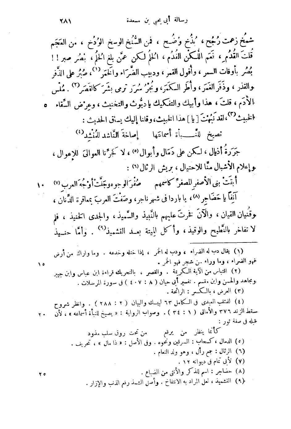 بصر بأوقات السمر، وافول القمر، ودبيب الضراء والخمر، صبر على الذفر والقذر، وذفر الغمر، وأطر الكمر، وبحر سرر ترمى بشر كالقصر. ملس الأدم، قلت، هذا وأبيك والتفكيك يا ديوث والتخنيث، وعرض السقاء الخبيث، لقد نبهت [يا] هذا الخبيث، وقلنا إليك يساق الحديث: