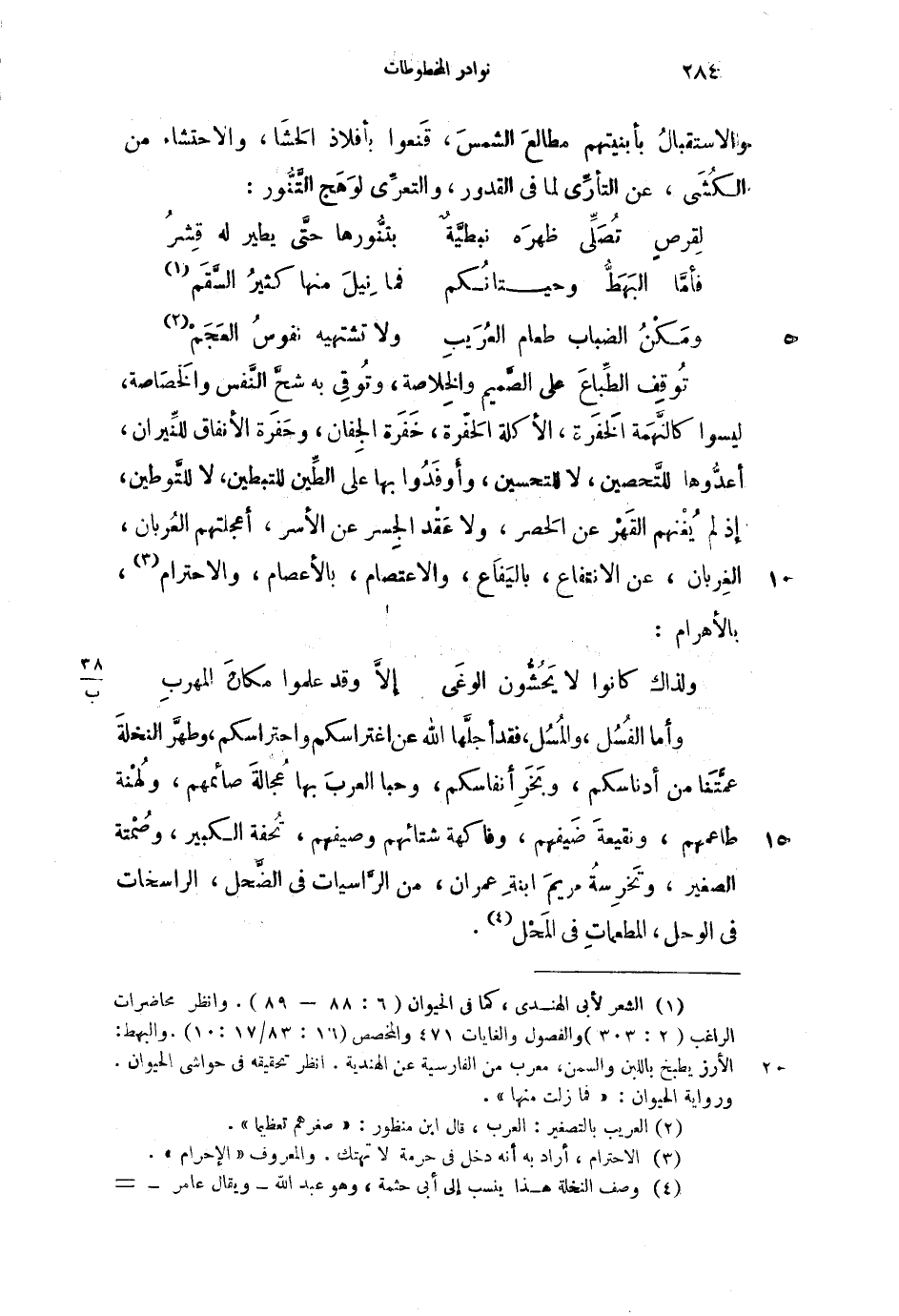 توقف الطباع على الصميم والخلاصة، وتوقي به شح النفس والخصاصة، ليسوا كالنهمة الخفرة، الأكلة الحفرة، خفرة الجفان، وحفرة الأنفاق للنيران، أعدوها للتحصين، لا للتحسين، وأوفدوا لها على الطين للتبطين، لا للتوطين، إذ لم يغنهم القهر عن الحصر، ولا عقد الجسر عن الأسر، أعجلتهم العربان، الغربان، عن الانتفاع، باليفاع، والاعتصام، بالأعصام، والاحترام، بالأهرام: