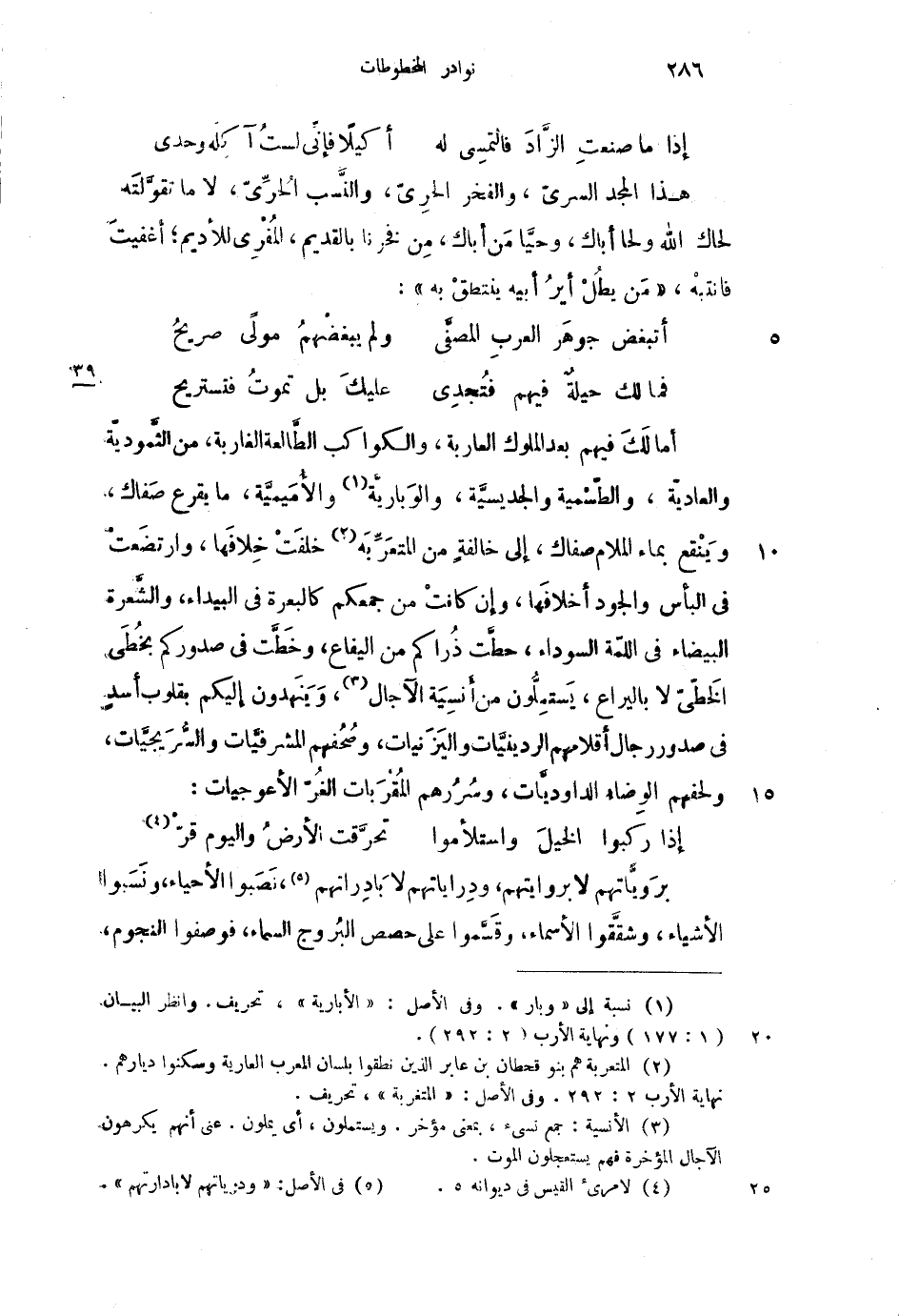 أما لك فيهم بعد الملوك العاربة، والكواكب الطالعة الغاربة، من الثمودية والعادية، والطسمية والجديسية، والوبارية، والأميمية، ما يقرع صفاك، وينقع بماء الملام صفاك، إلى خالفة من المتعربة خلفت خلافها، وارتضعت في البأس والجود أخلافها، وإن كانت من جمعكم كالبعرة في البيداء، والشعرة البيضاء في اللمة السوداء، حطت ذاركم من اليفاع، وخطت في صدوركم بخطى الخطى لا باليراع، يستملون من أنسية الآجال، وينهدون إليكم بقلوب أسدٍ في صدور رجال أقلامهم الردينيات واليزنيات، وصحفهم المشرفيات والسريجيات، ولحفهم الوضاء الداوديات، وسررهم المقربات الغر الأعوجيات: