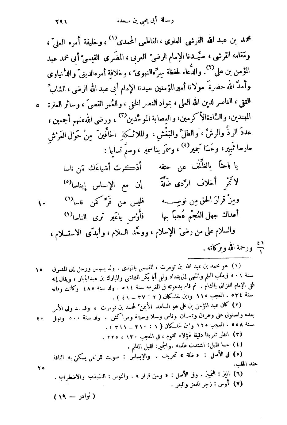 محمد بن عبد الله القرشي العلوي، الفاطمي المحمدي، وخليفة أمره العلي، ومقامه القرشي، سيدنا الإمام الرضي العربي، المضري القيسي أبي محمد عبد المؤمن بن علي. والدعاء لحفظة سره النبوي، وخلافة أمره الديني والدنيوي وأمد الله حضرة مولانا أمير المؤمنين سيدنا الإمام أبي عبد الله الرضي، الشاب التقي، الناصر لدين الله العلي، بمواد النصر الخفي، والعمر القصي، وسائر العترة المهتدين، والسادة الأكرمين، والعصابة الموحدين، ورضي الله عنهم أجمعين، عدد الرذ والرش، والطل والبغش، والملائكة الحافين من حول العرش مارسا ثبير وعسا جمير، وسمر بنا سمير، وسلم تسليما: