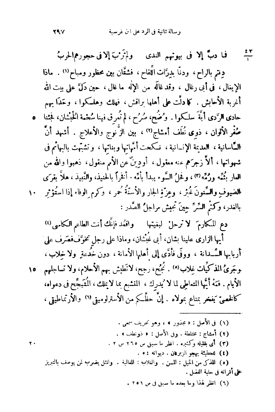 أيها الزاري علينا بشأن، أبي غبشان، وماذا على رجل تخوف فصرف على أربابها السدانة، فى فأدى إلى أهلها الأمانة، دون خدعة ولا خلال وجرى المذكيات غلاب، نجح، رجح، لا تطيش بهم الأحلام، ولا تساجلهم الأيام. فمه أيها المتعاطي لما لا يدرك، المتشبع بما لا يملك، المتبجح في دعواه، كالخصي يفخر بمتاع بمولاه. إن حظكم من الأسترلوميقي والأرتماطيقي،