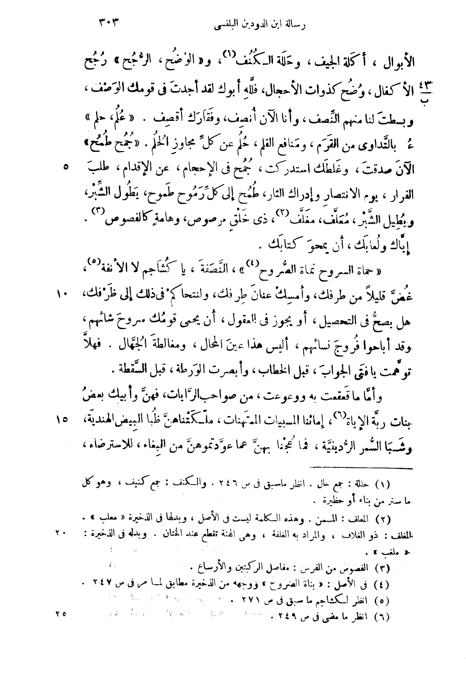 الأبوال، أكلة الجيف، وحللة الكنف، و"الوضح، الرجح" رجح الأكفال، وضح كذوات الأحجال، فلله أبوك لقد أجدت في قومك الوصف، وبسطت لنا منهم النصف، وأنا الآن أنصف، وفقارك أقصف. "علم، حلم" بالتداوي من القرم، ومنافع القلم، حلم عن كل مجاوز حلم. "جمح طمح" الآن صدقت، وغلطك استدركت، جمح في الإحجام، عن الإقدام، طلب الفرار، يوم الانتصار وإدراك الثأر، طمح إلى كل رموح طموح، يطول الشبر، ويطيل الشبر، معلف، مغلف، ذي خلق مرصوص، وهامةٍ كالفصوص، إياك ولعابك، أن يمحو كتابتك.