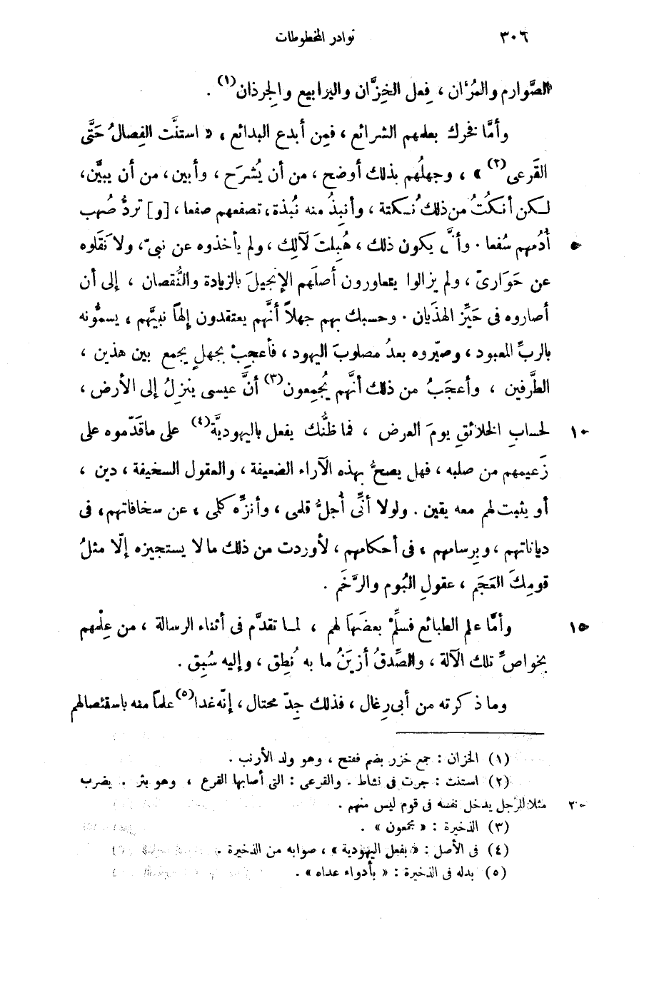 وأما فخرك بعلمهم الشرائع، فمن أبدع البدائع، "استنت الفصال حتى القرعى"، وجهلهم بذلك أوضح، من أن يشرح، وأبين، من أن يبين، لكن أنكت من ذلك نكتة، وأنبذ منه نبذة، تصفعهم صفعاً، [و] ترد صهب أدمهم سفعاً. وأن يكون ذلك، هبلت لآلك، ولم يأخذوه عن نبي، ولا نقلوه عن حواري، ولم يزالوا يتعاورون أصلهم الإنجيل بالزيادة والنقصان، إلى أن أصاروه في حيز الهذيان. وحسبك بهم جهلاً أنهم يعتقدون إلهاً نبيهم، يسمونه بالرب المعبود، وصيروه بعد مصلوب اليهود، فأعجب بجهل يجمع بين هذين، الطرفين، وأعجب من ذلك أنهم يجمعون أن عيسى ينزل إلى الأرض، لحساب الخلائق يوم العرض، فما ظنك يفعل باليهودية على ما قدموه على زعيمهم من صلبه، فهل يصح بهذه الآراء الضعيفة، والعقول السخيفة، دين، أو يثبت لهم معه يقين. ولولا أني أجل قلمي، وأنزه كلمي، عن سخافاتهم في ديانتهم، وبرسامهم، في أحكامهم، لأوردت من ذلك ما لا يستجيزه إلا مثل قومك العجم، عقول البوم والرخم.