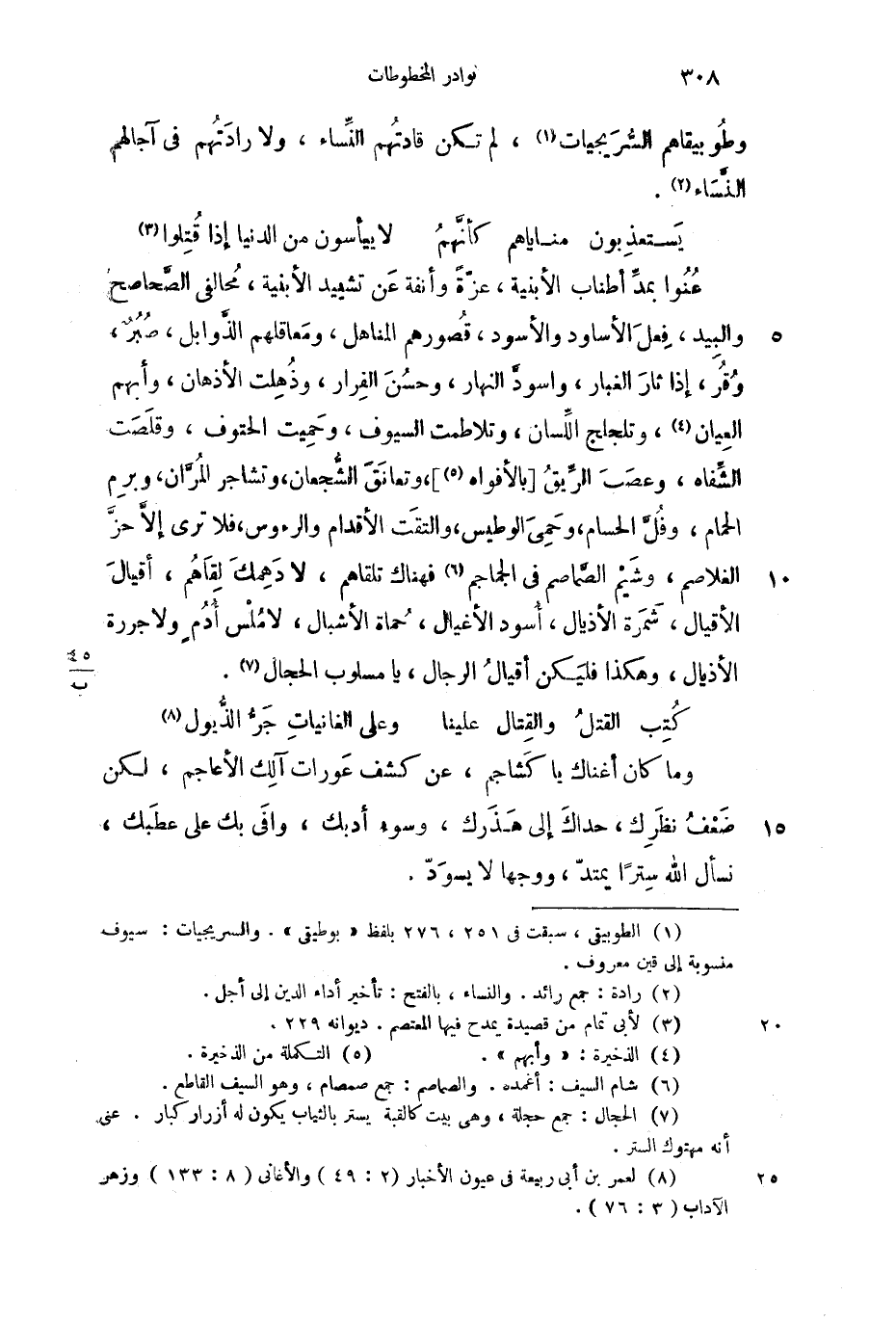 عنوا بمد أطناب الأبنية، عزة وأنفة عن تشييد الأبنية، نحالفي الصحاصح والبيد، فعل الأساود والأسود، قصورهم المناهل، ومعاقلهم الذوابل، صبرٌ، وقرُ، إذا ثار الغبار، واسود النهار، وحسن الفرار، وذهلت الأذهان، وأبهم العيان، وتلجلج اللسان، وتلاطمت السيوف، وحميت الحتوف، وقلصت الشفاه، وعصب الريق [بالأفواه] ، وتعانق الشجعان، وتشاجر المران، وبرم الحمام، وفل الحسام، وحمي الوطيس، والتقت الأقدام والرؤوس، فلا ترى إلا حزّ الغلاصم، وشيم الصماصم في الجماجم، فهناك تلقاهم، لا دهمك لقاهم، أقيال الأقيال، شمرة الأذيال، أسود الأغيال، حماة الأشبال، لا ملس أدم ولا جررة الأذيال، وهكذا فليكن أقيال الرجال، يا مسلوب الحجال.