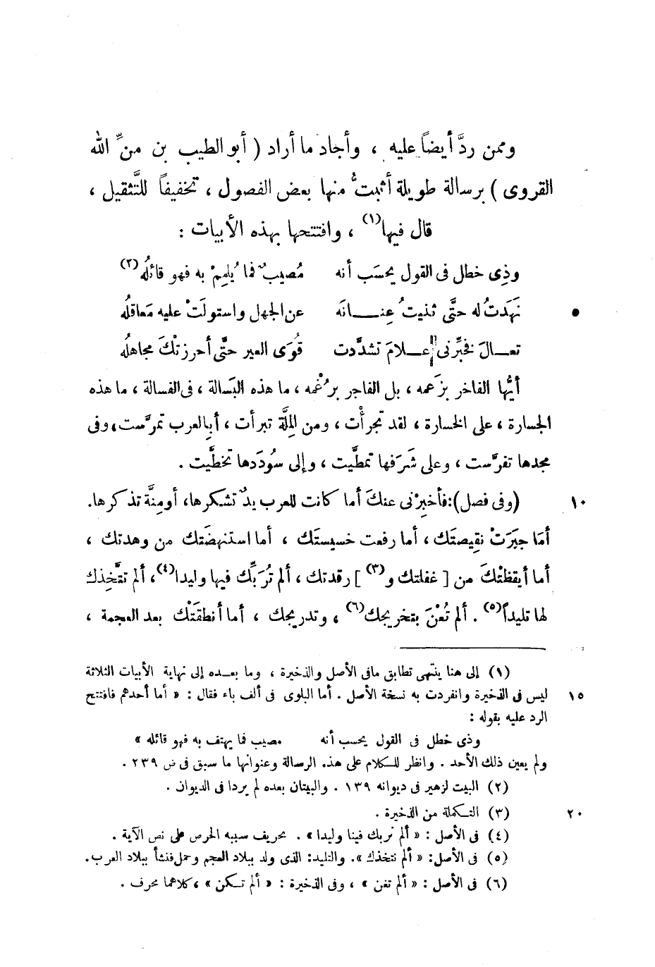 (وفي فصل) : فأخبرني عنك أما كانت للعرب يد تشكرها، أو منة تذكرها. أما جبرت نقيصتك، أما رفعت خسيستك، أما استنهضتك من وهدتك، أما أيقظتك من [غفلتك و] رقدتك، ألم تر بك فيها وليداً، ألم تتخذك لها تليداً. ألم تعن بتخريجك، وتدريجك، أما أنطقتك بعد العجمة،
