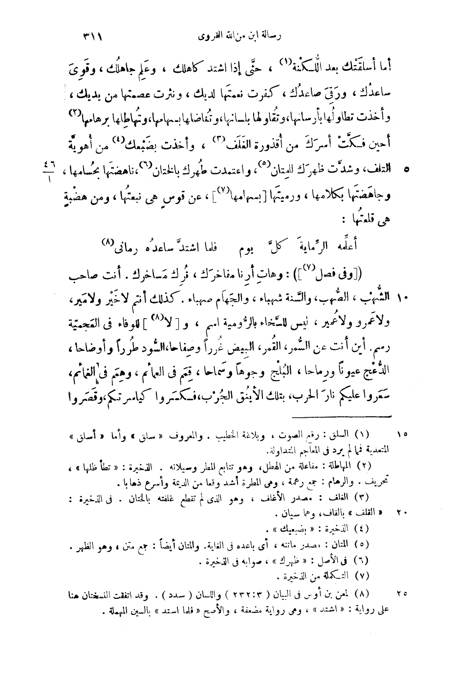 أما أسلقتك بعد اللكنة، حتى إذا اشتد كاهلك، وعلم جاهلك، وقوى ساعدك، ورقي صاعدك، كفرت نعمتها لديك، ونثرت عصمتها من يديك، وأخذت تطاولها بأرسانها، وتقاولها بلسانها، وتفاضلها بسهامها، وتهاطلها برهامها أحين فكت أسرك من أقذورة الغلف، وأخذت بضبعك من أهوية التلف، وشدت ظهرك للمتان، واعتمدت طهرك بالختان، ناهضتها بحسامها، وجاهضتها بكلامها، ورميتها [بسهامها] ، عن قوس هي نبعتها، ومن هضبة هي قلعتها: