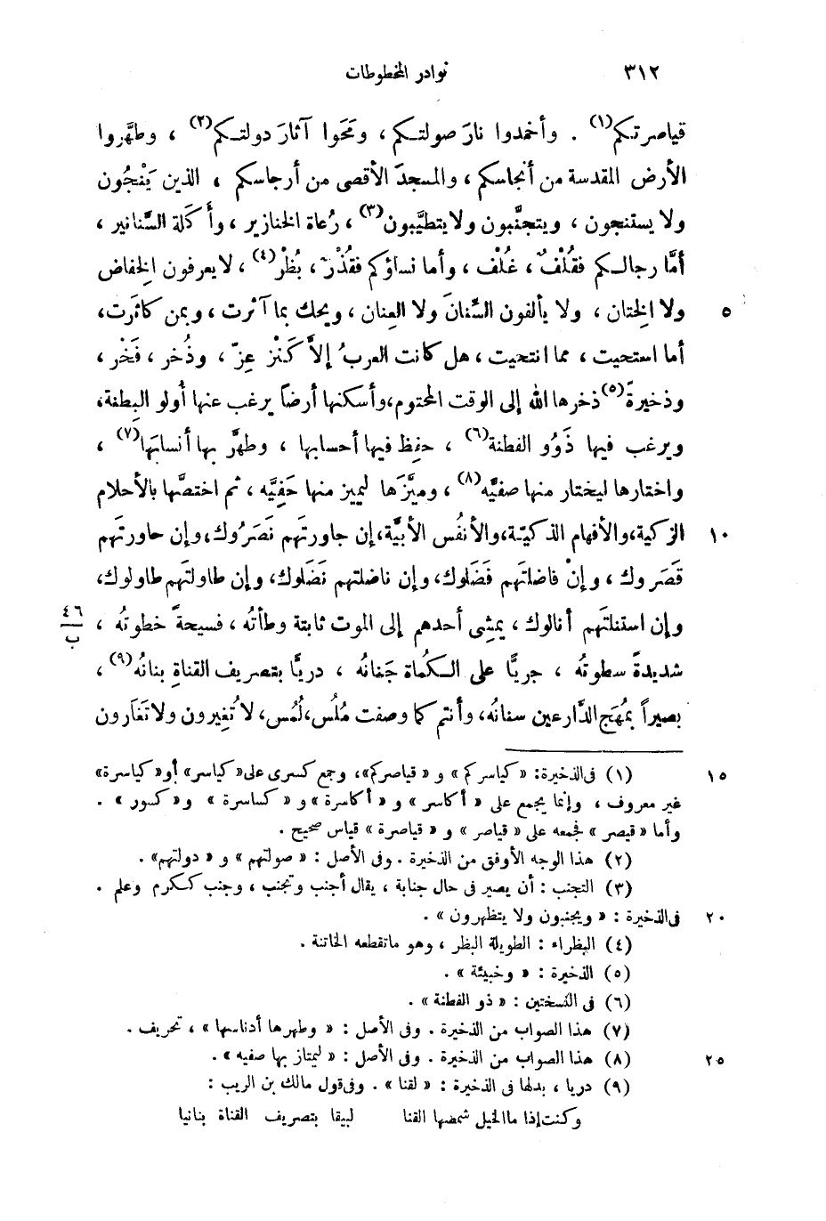 قياصرتكم. وأخمدوا نار صولتكم، ومحوا آثار دولتكم، وطهروا الأرض المقدسة من أنجاسكم، والمسجد الأقصى من أرجاسكم، الذين ينجون ولا يستنجون، ويتجنبون ولا يتطيبون، رعاة الخنازير، وأكلة السنانير، أما رجالكم فقلف، غلف، وأما نساؤكم فقذر، بظر، لا يعرفون الخفاض ولا الختان، ولا يألفون السنان ولا العنان، ويحك بما آثرت، وبمن كاثرت، أما استحيت، مما نتحيت، هل كانت العرب إلا كنز عز، وذخر، فخر، وذخيرة ذخرها الله إلى الوقت الوحتوم، وأسكتها أرضاً يرغب عنها أولو البطنة، ويرغب فيها ذوو الفطنة، حفظ فيها أحسابها، وطهر بها أنسابها، واختارها ليختار منها صفيه، وميزها ليميز منها حفيه، ثم اختصها بالأحلام الزكية، والأفهام الذكية، والأنفس الأبية، إن جاورتهم نصروك، وإن حاورتهم قصروك، وإن فاضلتهم فضلوك، وإن ناضلتهم نضلوك، وإن طاولتهم طاولوك، وإن استنلتهم أنالوك، يمشي أحدهم إلى الموت ثابتة وطأته، فسيحة خطوته، شديدة سطوته، جرياً على الكماة جنانه، درياً بتصريف القناة بنانه، بصيراً بمهج الدارعين سنانه، وأنتم كما وصفت ملس، لمس، لا تغيرون ولا تغارون