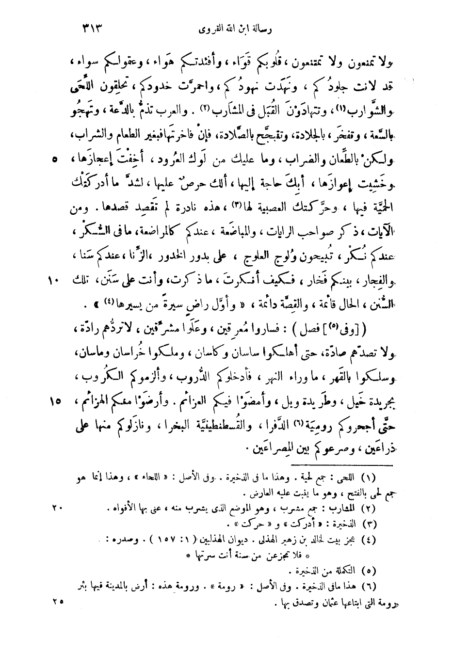 ( [وفي] فصل) : فساروا معرقين، وعلوا مشرقين، لا تردهم رادة، ولا تصدهم صادة، حتى أهلكوا ساسان وكاسان، وملكوا خراسان وماسان، وسلكوا بالقهر، ما وراء النهر، فأدخلوكم الدروب، وألزموكم الكروب، بجريدة خيل، وطريدة ويل، وأمضوا فيكم العزائم. وأرضوا منكم الهزائم، حتى أجحروكم رومية الدفرا، والقسطنطينية البخرا، ونازلوكم منها على ذراعين، وصرعوكم بين المصراعين.