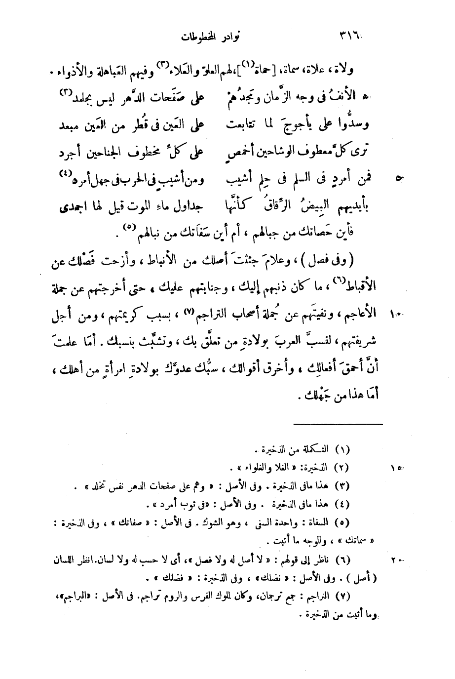 (وفي فصل) ، وعلام جثثت أصلك من الأنباط، وأزحت فصلك الأقباط، ما كان ذنبهم إليك، وجنايتهم عليك، حتى أخرجتهم عن جملة الأعاجم، ونفيتهم عن جملة أصحاب التراجم، بسبب كريمتهم، ومن أجل شريفتهم، لنسب العرب بولادة من تعلق بك، وتشبث بنسبك. أما علمت أن أحمق أفعالك، وأخرق أقوالك، سبك عدّوك بولادة امرأة من أهلك، أما هذا من جهلك.