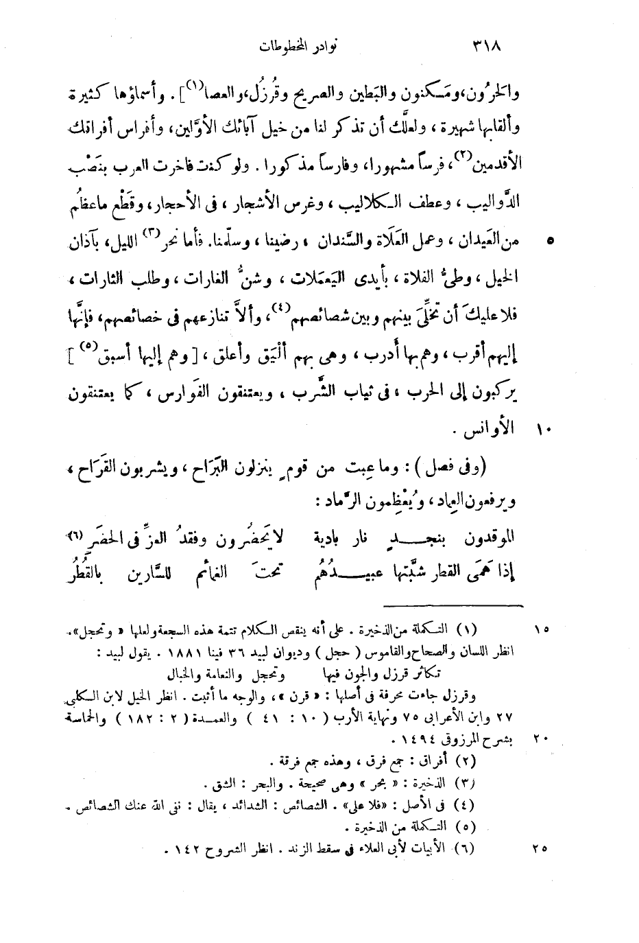 والحرون، ومكنون والبطين والصريح وقرزل، والعصا] . وأسماؤها كثيرة وألقابها شهيرة، ولعلك أن تذكر لنا من خيل آبائك الأولين، وأفراس أفراقك الأقدمين، فرساً مشهوراً، وفارساً مذكوراً. ولو كنت فاخرت العرب بنصب الدواليب، وعطف الكلاليب، وغرس الأشجار، في الأحجار، وقطع ما عظم من العيدان، وعمل العلاة والسندان، رضينا، وسلمنا. فأما نحر الليل، بآذان الخيل، وطئ الفلاة، بأيدي اليعملات، وشن الغارات، وطلب الثارات، فلا عليك أن تخلي بينهم وبين شصائصهم، وألا تنازعهم في خصائصهم، فإنها إليهم أقرب، وهم بها أدرب، وهي بهم أليق وأعلق، [وهم إليها أسبق] يركبون إلى الحرب، في ثياب الشرب، ويعتنقون الفوارس، كما يعتنقون الأوانس.