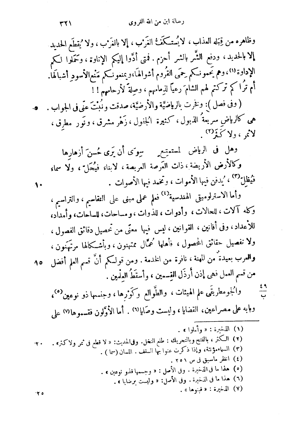 وأما الاسترلوميقي الهندسية فعلم عملي مبنى على التقاسيم، والتراسيم، وكله آلات، للحالات، وأدوات، للذوات، ومساحات، للساحات، وأمداد، للأعداد، وفي أفانين، القوانين، ليس فيها معنى من تحصيل دقائق الفصول، ولا تفصيل حقائق المحصول، فأهلها عمال ممتهنون، وبأشكالها مرتهنون، والعرب بعيدة من المهنة، نافرة من الخدمة. ومن قولكم أن قسم العلم أفضل من قسم العمل فهي إذن أرذل القسمين، وأسقط العلمين.