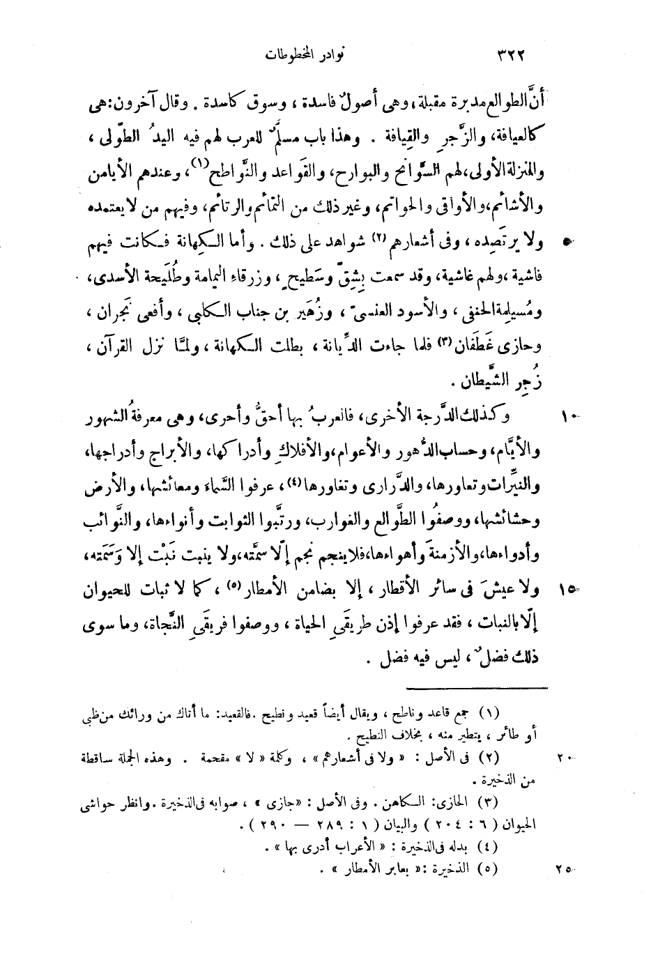أن الطوالع مدبرة مقبلة، وهي أصول فاسدة، وسوق كاسدة. وقال آخرون: هي كالعيافة، والزجر والقيافة. وهذا باب مسلم للعرب لهم فيه اليد الطولى، والمنزلة الأولى، لهم السوانح والبوارح، والقواعد والنواطح، وعندهم الأيامن والأشائم، والأواقى والحواتم، وغير ذلك من التمائم والرتائم، وفيهم من لا يعتمده ولا يرتصده، وفي أشعارهم شواهد على ذلك. وأما الكهانة فكانت فيهم فاشية، ولهم غاشية، وقد سمعت بشق وسطيح، وزرقاء اليمامة وطليحة الأسدي، ومسيلمة الحنفي، والأسود العنسي، وزهير بن جناب الكلبي، وأفعى نجران، وحازى غطفان، فلما جاءت الديانة، بطلت الكهانة، ولما نزل القرآن، زجر الشيطان.