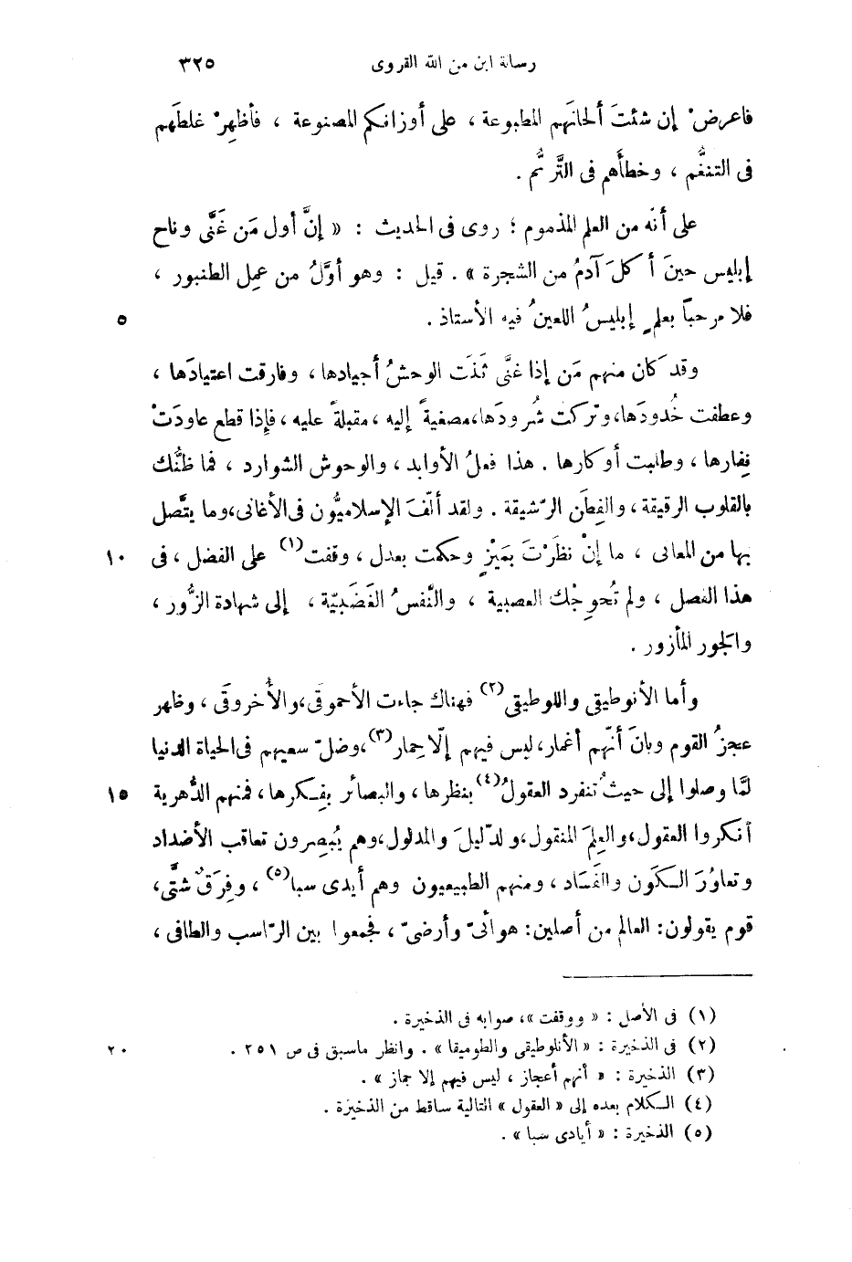 وأما الأنوطيقي واللوطيقي فهناك جاءت الأحموقي، والأخروقي، وظهر عجز القوم وبان أنهم أغمار، ليس فيهم إلا حمار، وضل سعيهم في الحياة الدنيا لما وصلوا إلى حيث تنفرد العقول بنظرها، والبصائر بفكرها، فمنهم الدهرية أنكروا العقول، والعلم المنقول، والدليل والمدلول، وهم يبصرون تعاقب الأضداد وتعاور الكون والفساد، ومنهم الطبيعيون وهم أيدي سبا، وفرق شتى، قوم يقولون: العالم من أصلين: هوائي وأرضي، فجمعوا بين الراسب والطافي،