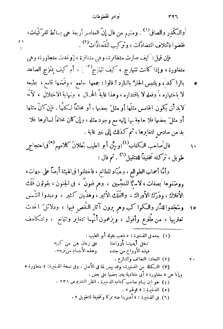قال صاحب الكتاب: وبين أبو الطيب بطلان كلامهم في احتجاج طويل، تركته تخفيفاً للتثقيل. ثم قال: وأما أصحاب الطوالع، وعباد المطالع، فاختلفوا في الهيئة أيضاً على جهات، ووصفوها بصفات، لا سيما المنجمين، وهم فنون، في الجنون، يقولون فلك الأفلاك، ودرك الأدراك، والفلك الأثير، وهذيان كثير، وعبدوا الشمس وسجدوا للنار والكواكب وهم يرون آثار النقص فيها، ودلائل الحدث تعتريها، من طلوع وأفول، ويزعمون أنها تتغاير وتتمانع، وتتكاسف