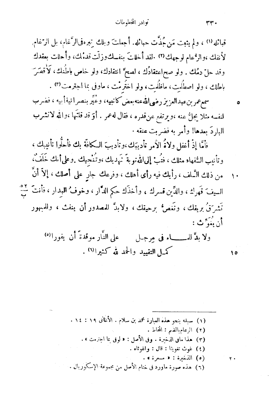 فأما إذ أغفل ولاة الأمر تأديبك، وتأديب الكافة بك فأحلوا تأنيبك، وتأنيب السفهاء مثلك، فتب إلى الله توبة تهديك وتنجيك، وعلى أنك خلفٌ، من ذلك السلف، رأيك فيه رأي أهلك، وفرعك جارٍ على أصلك، إلا أن السيف قهرك، والدين قسرك، وأخذك حكم الدار، وخوف البدار، فأنت تشرق بريقك، وتغص برحيقك، ولابد للمصدور أن ينفث، وللمبهور أن يغوث: