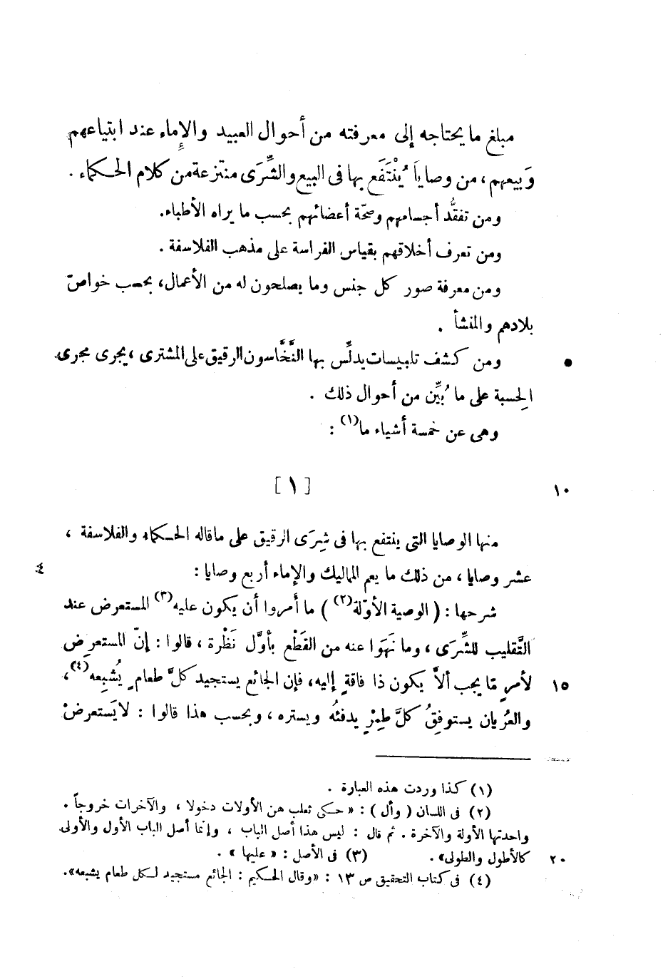 وهي عن خمسة أشياء ما: [1] منها الوصايا التي ينتفع بها في شرى الرقيق على ما قاله الحكماء والفلاسفة، عشر وصايا، من ذلك ما يعمم المماليك والإماء أربع وصايا: شرحها: (الوصية الأولى) ما أمروا أن يكون عليه المستعرض عند التقليب للشرى، وما نهوا عنه من القطع بأول نظرة، قالوا: إن المستعرض لأمر ما يجب ألا يكون ذا فاقة إليه، فإن الجائع يستجيد كل طعام يشبعه، والعريان يستوفق كل طمر يدفئه ويستره، وبحسب هذا قالوا: لا يستعرض