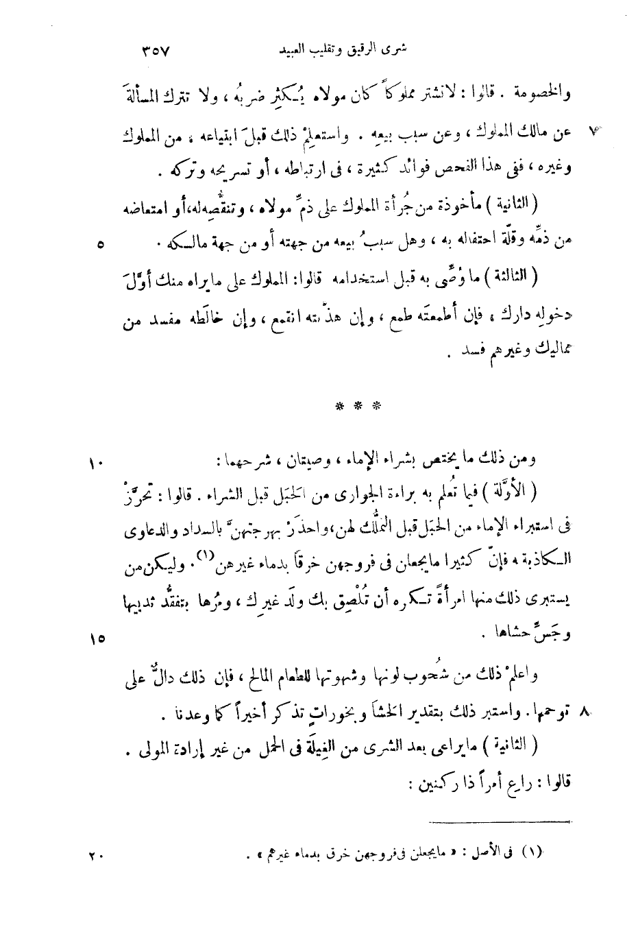 والخصومة. قالوا: لا نشتر مملوكاً كان مولاه يكثر ضربه، ولا تترك المسألة عن مالك المملوك، وعن سبب بيعه. واستعلم ذلك قبل ابتياعه، من المملوك وغيره، ففي هذا الفحص فوائد كثيرة، في ارتباطه، أو تسريحه وتركه.