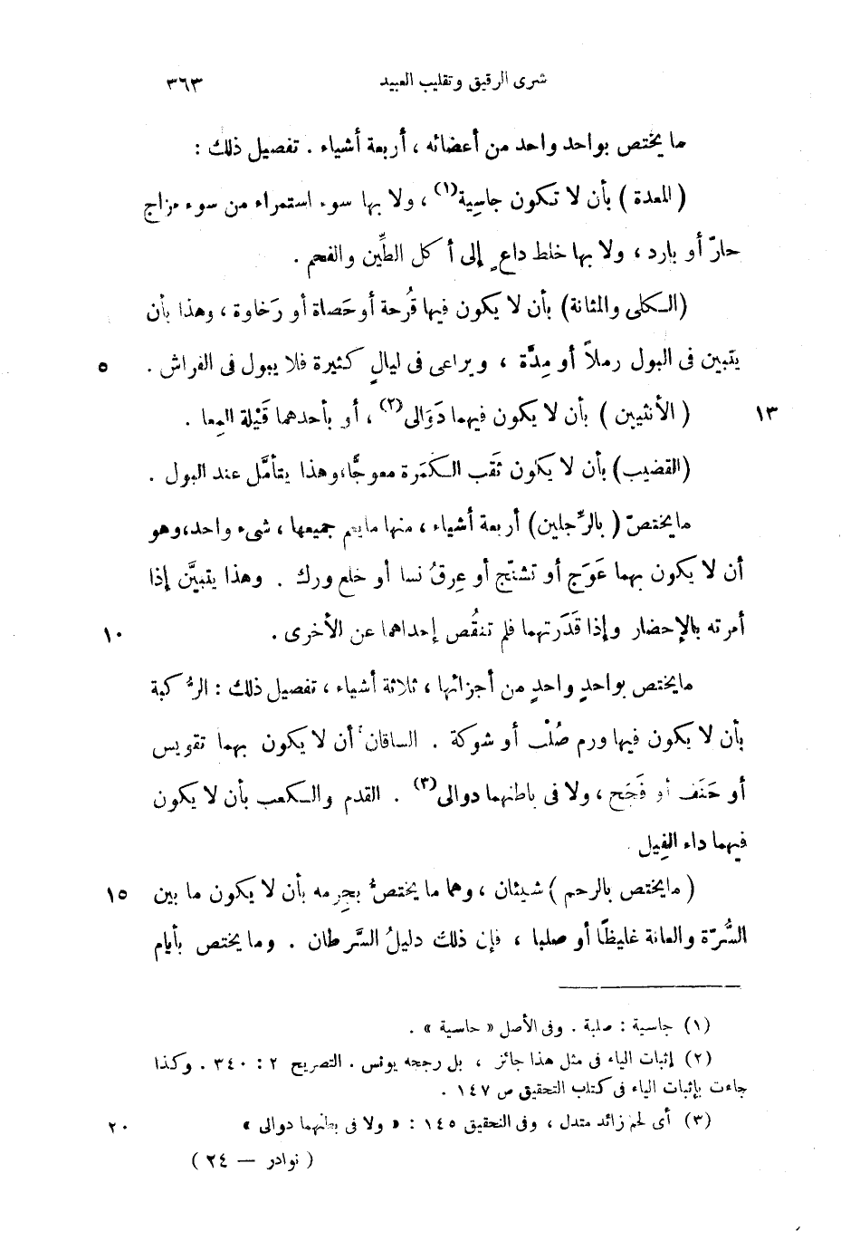 ما يختص (بالرجلين) أربعة أشياء، منها ما يعم جميعها، شيء واحد، وهو بأن لا يكون بهما عوج أو تشنج أو عرق نسا أو خلع ورك. وهذا يتبين إذا أمرته بالإحضار وإذا قدرتهما فلم تنقص إحداهما عن الأخرى.