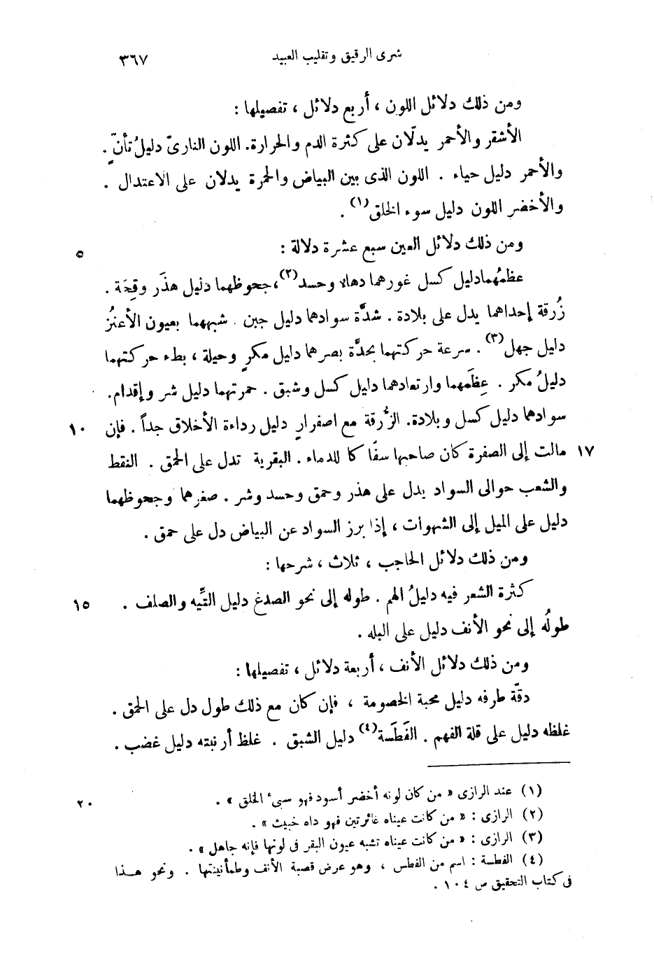 ومن ذلك دلائل اللون، أربع دلائل، تفصيلها: الأشقر والأحمر يدلان على كثرة الدم والحرارة. اللون الناري دليل تأن. والأحمر دليل حياء. اللون الذي بين البياض والحمرة يدلان على الاعتدال. والأخضر يدل على سوء الخلق.
