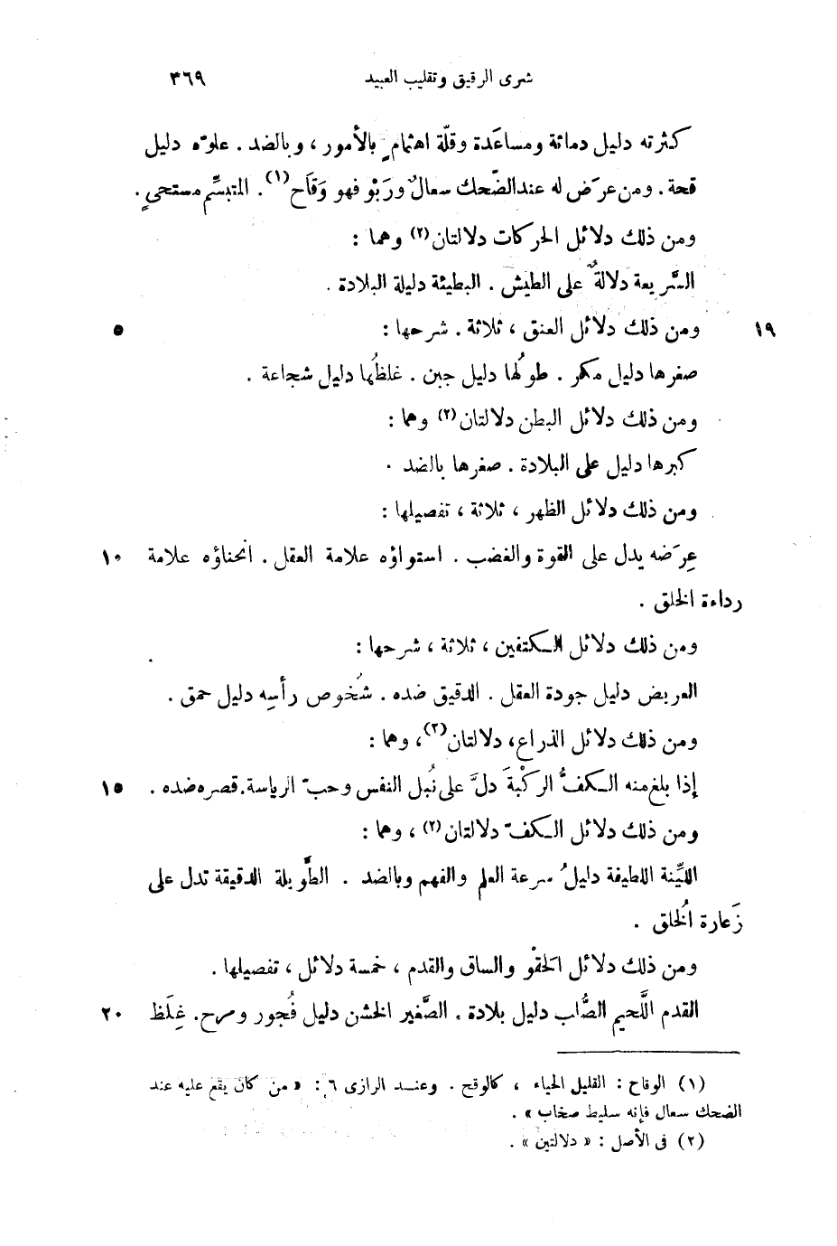ومن ذلك دلائل الحقو واللسان والساق والقدم، خمسة دلائل، تفصيلها: القدم واللحية الصلب دليل بلادة. الصغير الخشن دليل فجور ومرح غلظ