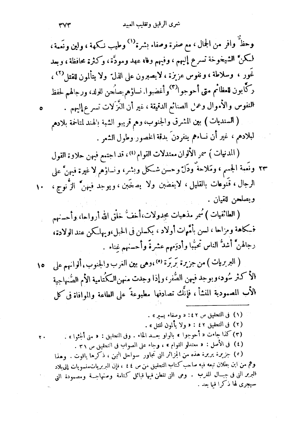 (البربريات) من جزيرة بربرة، وهي بين الغرب والجنوب، ألوانهم على الأكثر سود، ويوجد فيهن الصفر، وإذا وجدت منهن الكتامية الأم الصهاجية الأب المصمودية المنشأ، فإنك تصادفها مطبوعة على الطاعة والموافاة في كل