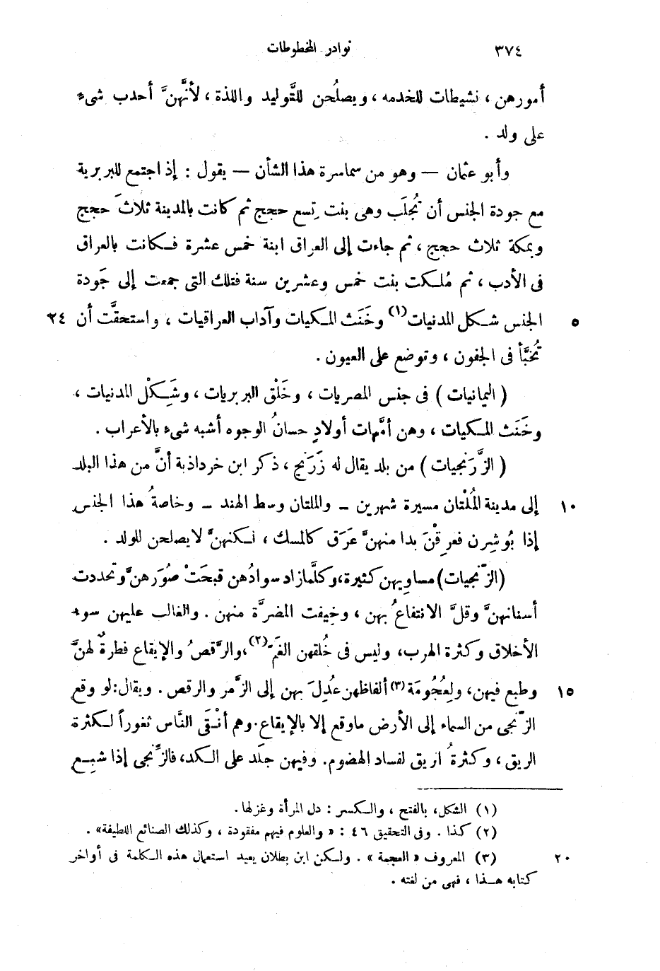 وأبو عثمان وهو من سماسرة هذا الشأن يقول: إذا اجتمع للبربرية مع جودة الجنس أن تجلب وهي بنت تسع حجيج ثم كانت بالمدينة ثلاث حجج وبمكة ثلاث حجج، ثم جاءت إلى العراق ابنة خمس عشرة فكانت بالعراق في الأدب، ثم ملكت بنت خمس وعشرين سنة فتلك التي جمعت إلى جودة الجنس شكل المدنيات وخنث المكيات وآداب العراقيات، واستحقت أن تخبأ في الجفون، وتوضع على العيون.