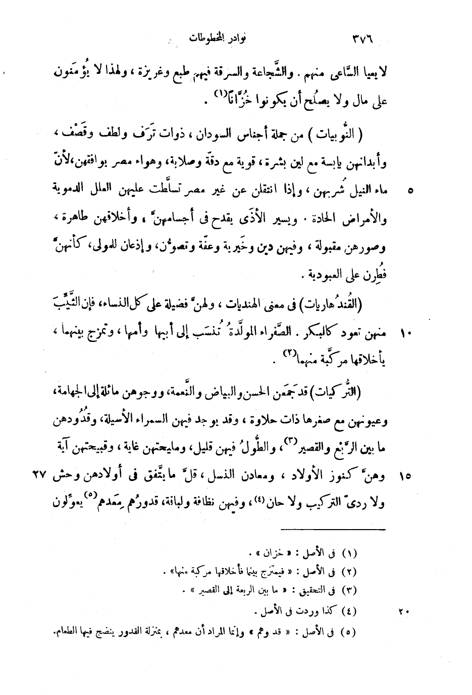 (النوبيات) من جملة أجناس السودان، ذوات ترف ولطف وقصف، وأبدانهن يابسة مع لين بشرة، قوية مع دقة وصلابة، وهواء مصر يوافقهن، لأن ماء النيل شربهن، وإذا انتقلن عن غير مصر تسلطت عليهن العلل الدموية والأمراض الحادة. ويسير الأذى يقدح في أجسامهن، وأخلاقهن طاهرة، وصورهن مقبولة، وفيهن دين وخيريةى وعفة وتصوّن، وإذعان للمولى، كأنهن فطرن على العبودية.