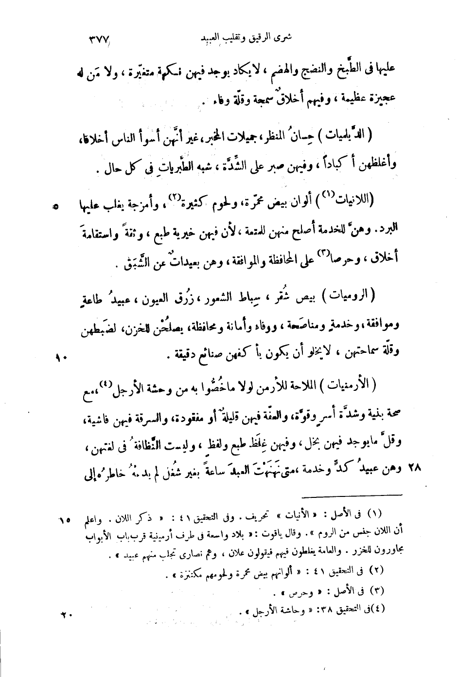 (الروميات) بيض شقر، سباط الشعور، زرق العيون، عبيد طاعة وموافقة، وخدمة ومناصحة، ووفاء وأمانة ومحافظة، يصلحن للخزن، لضبطهن وقلة سماحتهن، لا يخلو أن يكون بأكفهن صنائع دقيقة.