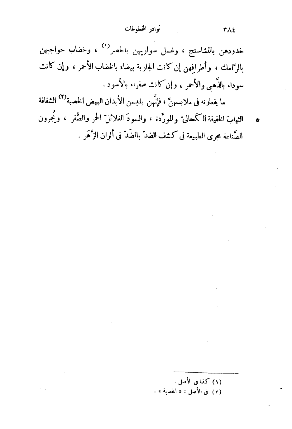 ما يفعلونه في ملابسهن، فإنهن يلبسن الأبدان البيض الخصبة الشفافة الثياب الخفيفة الكحالي والموردة، والسود الغلائل الحمر والصفر، ويجرون الصناعة مجرى الطبيعة في كشف الضد بالضد في ألوان الزهر.