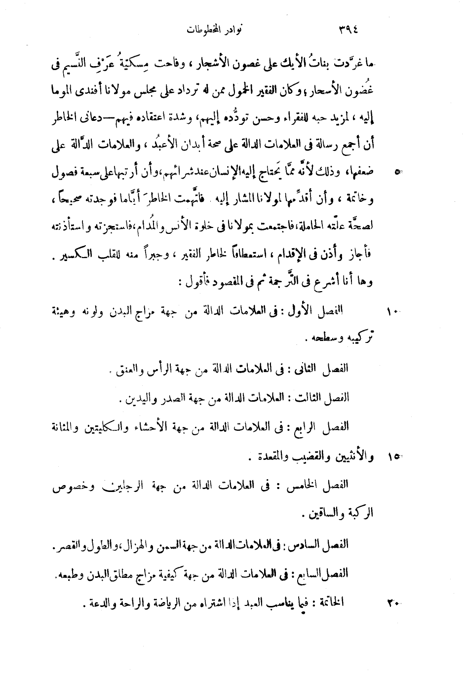 ما غردت بنات الأيك على غصون الأشجار، وفاحت مسكية عرف النسيم في غضون الأسحار، وكان الفقير الخمول ممن له ترداد على مجلس مولانا أفندي الموما إليه، لمزيد حبه للفقراء وحسن تودده إليهن، وشدة اعتقاده فيهم دعاني الخاطر أن أجمع رسالة في العلامات الدالة على صحة أبدان الأعبد، والعلامات الدالة على ضعفها، وذلك لأنه مما يحتاج إليه الإنسان عند شرائهم، وأن أرتبها على سبعة فصول وخاتمة، وأن أقدمها لمولانا المشار إليه. فاتهمت الخاطر أياماً فوجدته صحيحاً، لصحة علته الحاملة، فاجتمعت بمولانا في خلوة الأنس والمدام، فاستجزته واستأذنته فأجاز وأذان في الإقدام، استعطافاً لخاطر الفقير، وجبراً منه للقلب الكسير.