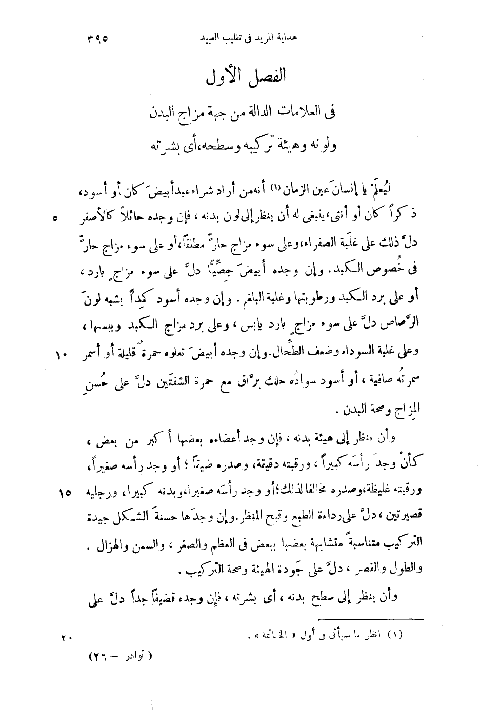 في العلامات الدالة من جهة مزاج البدن ولونه وهيئة تركيبه وسطحه أي بشرته ليعلم يا إنسان عين الزمان أنه من أراد شراء عبداً أبيض كان أو أسود، ذكراً كان أو أنثى، ينبغي له أن ينظر إلى لون بدنه، فإن وجده حائلاً كالأصفر دل ذلك على غلبة الصفراء، وعلى سوء مزاج حار مطلقاً، أو على سوء مزاج حار في خصوص الكبد. وإن وجده أبيض جصياً دل على سوء مزاج بارد، أو على برد الكبد ورطوبتها وغلبة البلغم. وإن وجده أسود كمداً يشبه لون الرصاص دل على سوء مزاج بارد يابس، وعلى برد مزاج الكبد ويبسها، وعلى غلبة السوداء وضعف الطحال. وإن وجده أبيض تعلوه حمرة قليلة أو أسمر سمرته صافية، أو أسود سواده حلك براق مع حمرة الشفتين دل على حسن المزاج وصحة البدن.