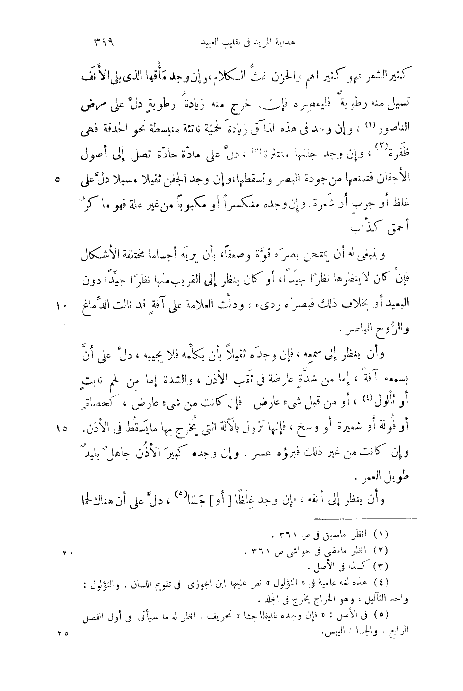 وأن ينظر إلى سمعه فإن وجده ثقيلاً بأن يكلمه فلا يجيبه، دل على أن بسمعه آفة، إما من شدة عارضة في ثقب الأذن، والشدة إما من لحم نابت أو ثألول، أو من قبل شيء عارض. فإن كانت من شيء عارض، كحصاة أو فولة أو شعيرة أو وسخ، فإنها تزول بالآلة التي يخرج بها ما يسقط في الأذن. وإن كانت من غير ذلك فبرؤه عسر. وإن وجده كبير الأذن جاهل بليد طويل العمر.