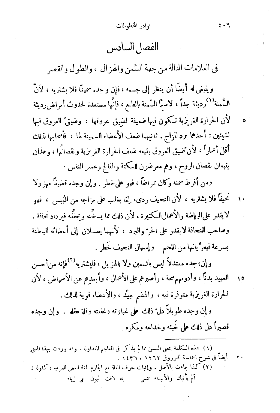 في العلامات الدالة من جهة السمن والهزال، والطول والقصر وينبغي له أيضاً أن ينظر إلى جسمه، فإن وجده سميناًُ فلا يشتريه، لأن السمنة رديئة جداً، لا سيما السمنة بالطبع، فإنها مستعدة لحدوث أمراض رديئة لأن الحرارة الغريزية تكون فيها ضعيفة لضيق عروقها، وضيق العروق فيها لشيئين: أحدهما برد المزاج، ثانيهما ضعف الأعضاء السمينة لها، فأصحابها لذلك أقل أعماراً لأن ضيق العروق يتبعه ضعف الحرارة الغريزية ونقصانها، وهذان يتبعان نقصان الروح، وهم معرضون للسكتة والفالج وعسر النفس.