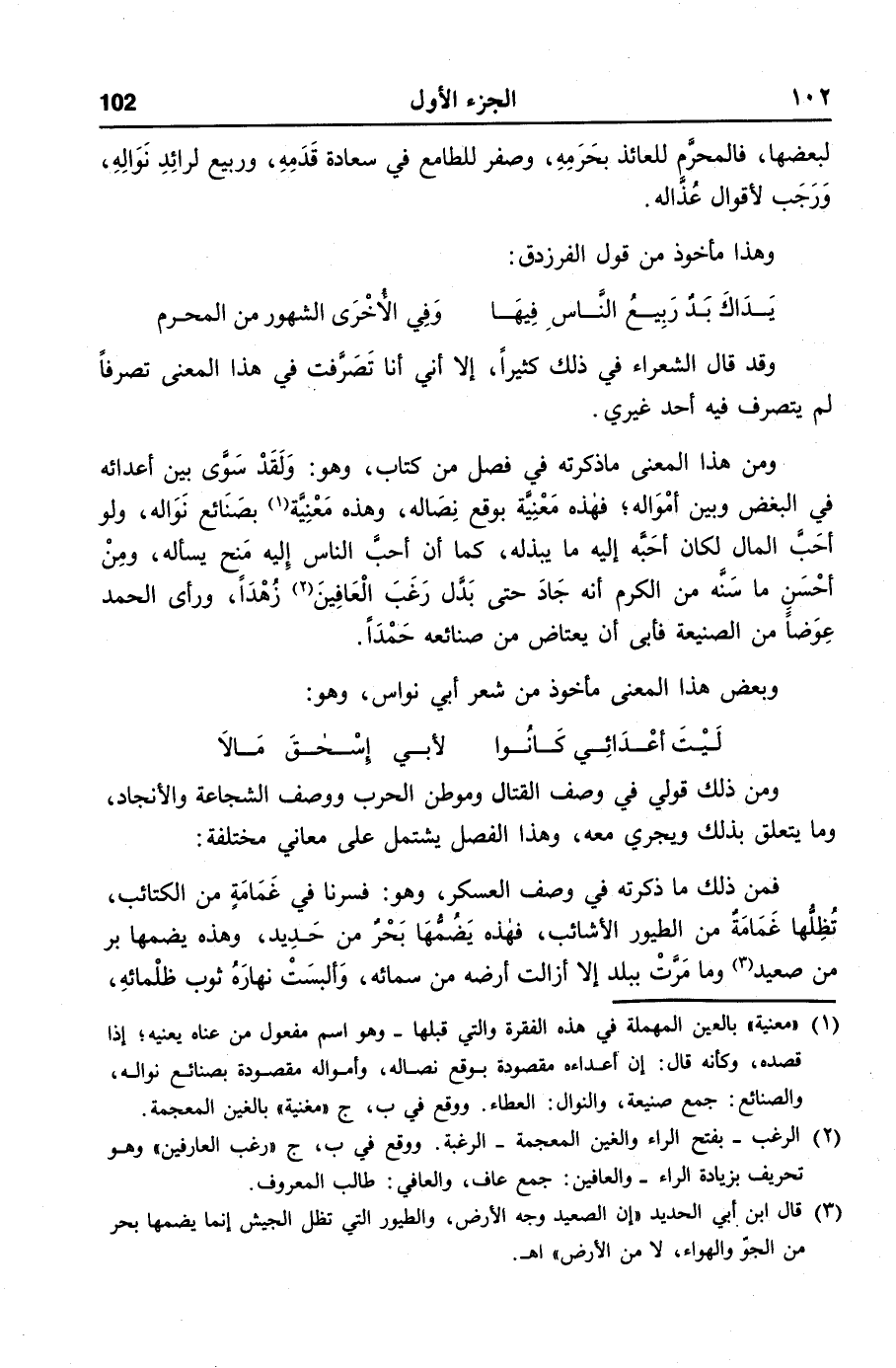 ومن هذا المعنى ما ذكرته في فصل من كتاب، وهو: ولقد سوّى بين أعدائه في البغض وبين أمواله؛ فهذه معنيّة بوقع نصاله، وهذه معنيّة «1» بصنائع نواله، ولو أحبّ المال لكان أحبّه إليه ما يبذله، كما أن أحبّ الناس إليه منح يسأله، ومن أحسن ما سنّه من الكرم أنه جاد حتى بدّل رغب العافين «2» زهدا، ورأى الحمد عوضا من الصنيعة فأبى أن يعتاض من صنائعه حمدا.