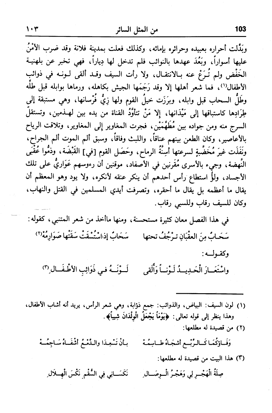 وبدّلت أحراره بعبيده وحرائره بإمائه، وكذلك فعلت بمدينة فلانة وقد ضرب الأمن عليها أسوارا، وبعد عهدها بالنوائب فلم تدخل لها ديارا، فهي تخبر عن بلهنية الخفض ولم ترع عنه بالانتقال، ولا رأت السيف وقد ألقى لونه في ذوائب الأطفال «1» ، فما شعر أهلها إلا وقد رجمها الجيش بكاهله، ورماها بوابله قبل طلّه وطلّ السحاب قبل وابله، وبرزت خيل القوم ولها زيّ فرسانها، وهي مستبقة إلى طرادها كاستباقها إلى ميدانها، إلا من تتأوّد القناة من يده بين لهذمين، وتستقلّ السرج منه ومن جواده بين مطهّمين، فجرت المغاوير إلى المغاوير، وتلاقت الرياح بالأعاصير، وكان الطعن بينهم عناقا، واللبث وفاقا، وسبق ألم الموت ألم الجراح، ونفذت غير مخضّبة لسرعتها أسنّة الرماح، وحصل القوم [في] القبضة، وذمّوا عقبى النّهضة، وجيء بالأسرى مقرنين في الأصفاد، موقنين أن رءوسهم عواريّ على تلك الأجساد، ولو استطاع رأس أحدهم أن ينكر عنقه لأنكره، ولا يود وهو المعظم أن يقال ما أعظمه بل يقال ما أحقره، وتصرفت أيدي المسلمين في القتل والنهاب، وكان للسيف رقاب وللسبي رقاب.