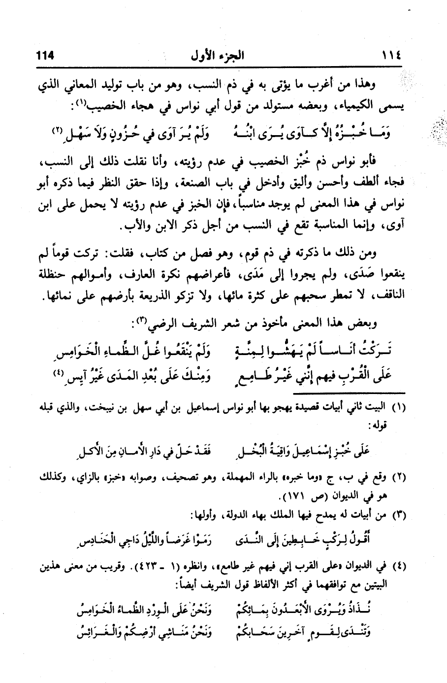 فأبو نواس ذم خبز الخصيب في عدم رؤيته، وأنا نقلت ذلك إلى النسب، فجاء ألطف وأحسن وأليق وأدخل في باب الصنعة، وإذا حقق النظر فيما ذكره أبو نواس في هذا المعنى لم يوجد مناسبا، فإن الخبز في عدم رؤيته لا يحمل على ابن آوى، وإنما المناسبة تقع في النسب من أجل ذكر الابن والأب.