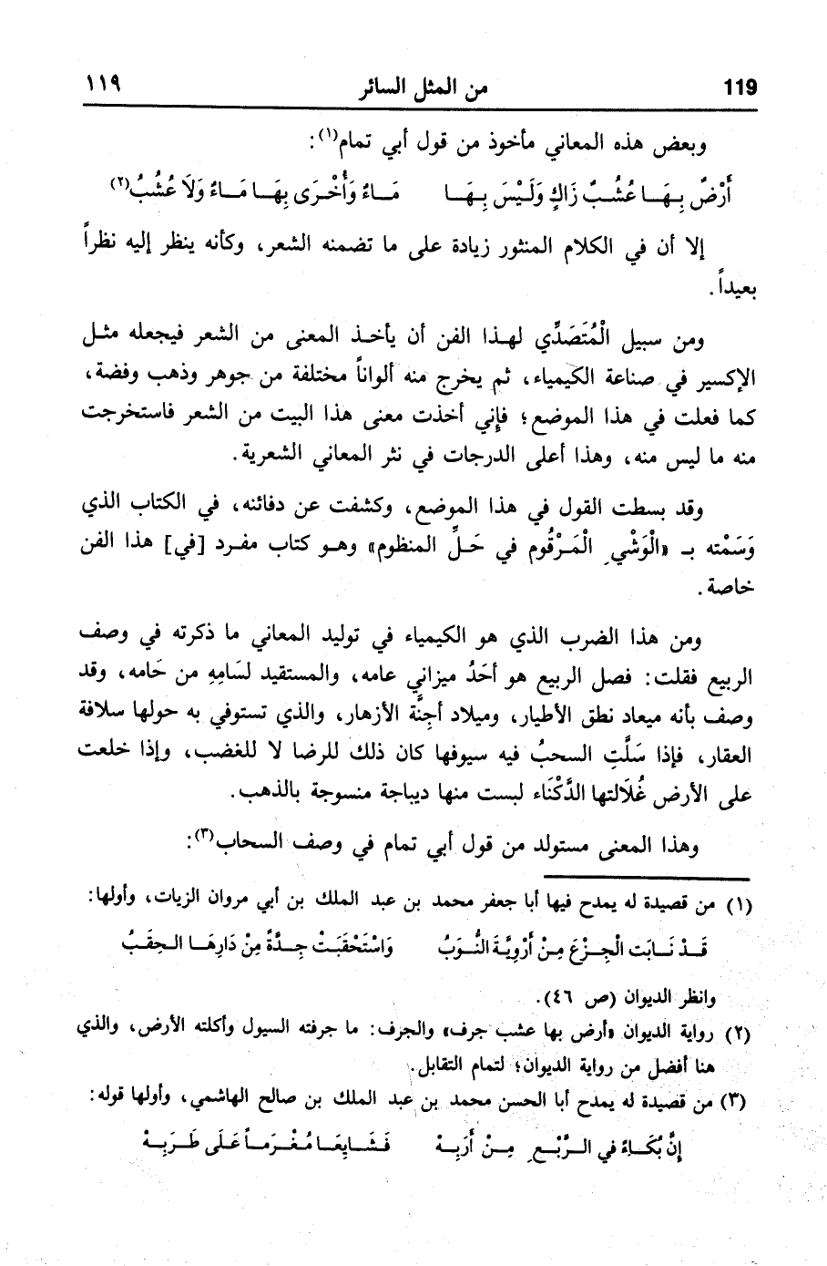 ومن هذا الضرب الذي هو الكيمياء في توليد المعاني ما ذكرته في وصف الربيع فقلت: فصل الربيع هو أحد ميزاني عامه، والمستقيد لسامه من حامه، وقد وصف بأنه ميعاد نطق الأطيار، وميلاد أجنّة الأزهار، والذي تستوفي به حولها سلافة العقار، فإذا سلّت السحب فيه سيوفها كان ذلك للرضا لا للغضب، وإذا خلعت على الأرض غلالتها الدّكناء لبست منها ديباجة منسوجة بالذهب.