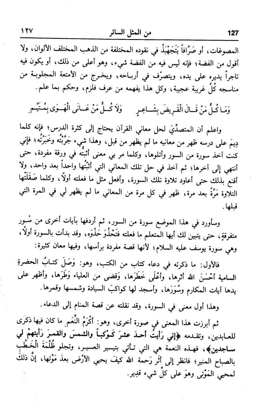 وسأورد في هذا الموضع سورة من السور، ثم أردفها بآيات أخرى من سور متفرقة، حتى يتبين لك أيها المتعلم ما فعلته فتحذو حذوه، وقد بدأت بالسورة أولا، وهي سورة يوسف عليه السلام؛ لأنها قصة مفردة برأسها، وفيها معان كثيرة: