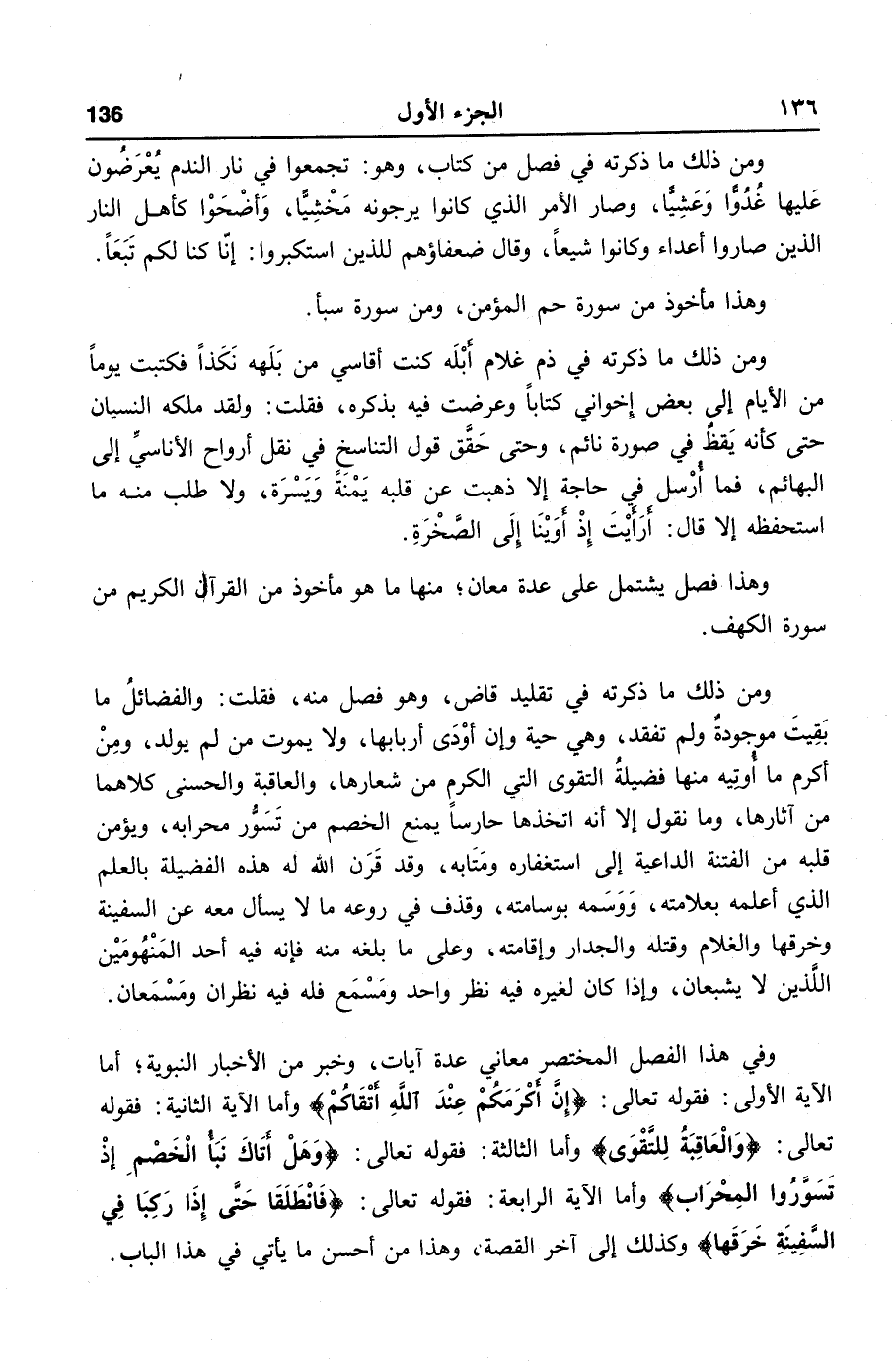 وفي هذا الفصل المختصر معاني عدة آيات، وخبر من الأخبار النبوية؛ أما الآية الأولى: فقوله تعالى: إن أكرمكم عند الله أتقاكم