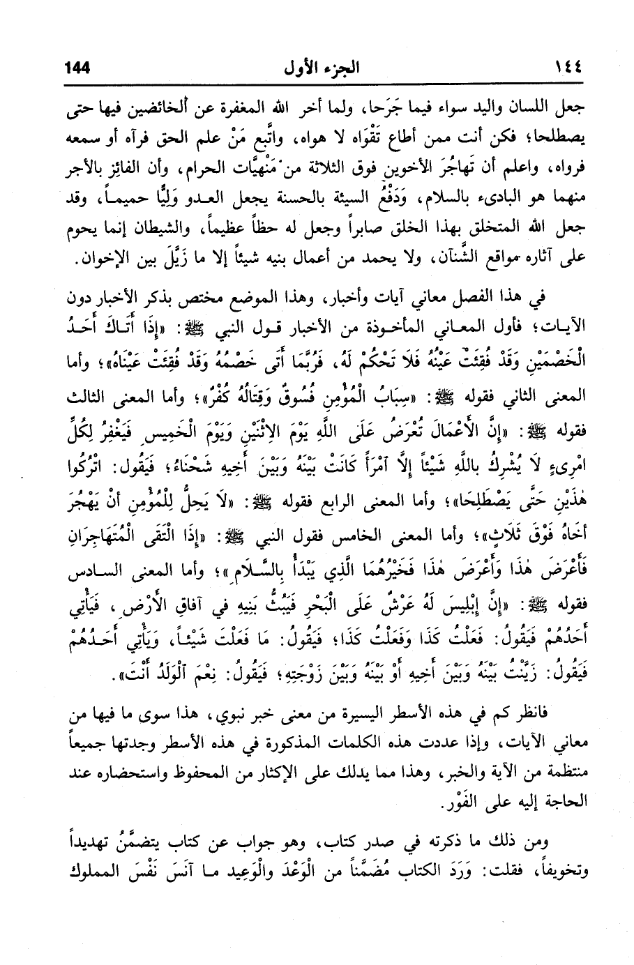 في هذا الفصل معاني آيات وأخبار، وهذا الموضع مختص بذكر الأخبار دون الآيات؛ فأول المعاني المأخوذة من الأخبار قول النبي صلّى الله عليه وسلّم: «إذا أتاك أحد الخصمين وقد فقئت عينه فلا تحكم له، فربّما أتى خصمه وقد فقئت عيناه» ؛ وأما المعنى الثاني فقوله صلّى الله عليه وسلّم: «سباب المؤمن فسوق وقتاله كفر» ؛ وأما المعنى الثالث فقوله صلّى الله عليه وسلّم: «إنّ الأعمال تعرض على الله يوم الاثنين ويوم الخميس فيغفر لكلّ امرئ لا يشرك بالله شيئا إلّا امرأ كانت بينه وبين أخيه شحناء؛ فيقول: اتركوا هذين حتّى يصطلحا» ؛ وأما المعنى الرابع فقوله صلّى الله عليه وسلّم: «لا يحل للمؤمن أن يهجر أخاه فوق ثلاث» ؛ وأما المعنى الخامس فقول النبي صلّى الله عليه وسلّم: «إذا التقى المتهاجران فأعرض هذا وأعرض هذا فخيرهما الّذي يبدأ بالسّلام» ؛ وأما المعنى السادس فقوله صلّى الله عليه وسلّم: «إنّ إبليس له عرش على البحر فيبثّ بنيه في آفاق الأرض، فيأتي أحدهم فيقول: فعلت كذا وفعلت كذا؛ فيقول: ما فعلت شيئا، ويأتي أحدهم فيقول: زيّنت بينه وبين أخيه أو بينه وبين زوجته؛ فيقول: نعم الولد أنت» .