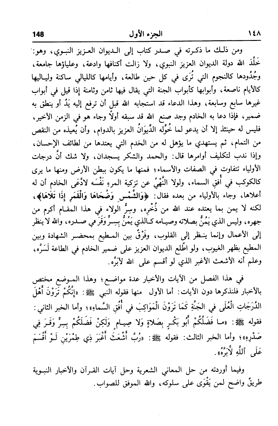 خلّد الله دولة الديوان العزيز النبوي، ولا زالت أكنافها وادعة، وعلياؤها جامعة، وجدودها كالنجوم التي ترى في كل حين طالعة، وأيامها كالليالي ساكنة ولياليها كالأيام ناصعة، وأبوابها كأبواب الجنة التي يقال فيها ثامن وثامنة إذا قيل في أبواب غيرها سابع وسابعة، وهذا الدعاء قد استجابه الله قبل أن ترفع إليه يد أو ينطق به ضمير، فإذا دعا به الخادم وجد صنع الله قد سبقه أولا وجاء هو في الزمن الأخير، فليس له حينئذ إلا أن يدعو لما خوّله الدّيوان العزيز بالدوام، وأن يعيذه من النقص من التمام، ثم يستهدي ما يؤهل له من الخدم التي يعتدها من لطائف الإحسان، وإذا ندب لتكليف أوامرها قال: والحمد والشكر يسجدان، ولا شك أنّ درجات الأولياء تتفاوت في الصفات والأسماء؛ فمنها ما يكون ببطن الأرض ومنها ما يرى كالكوكب في أفق السماء، ولولا النّهي عن تزكية المرء نفسه لادّعى الخادم أن له أعلاها، وجاء بالأولياء من بعده فقال: «والشمس وضحاها والقمر إذا تلاها»