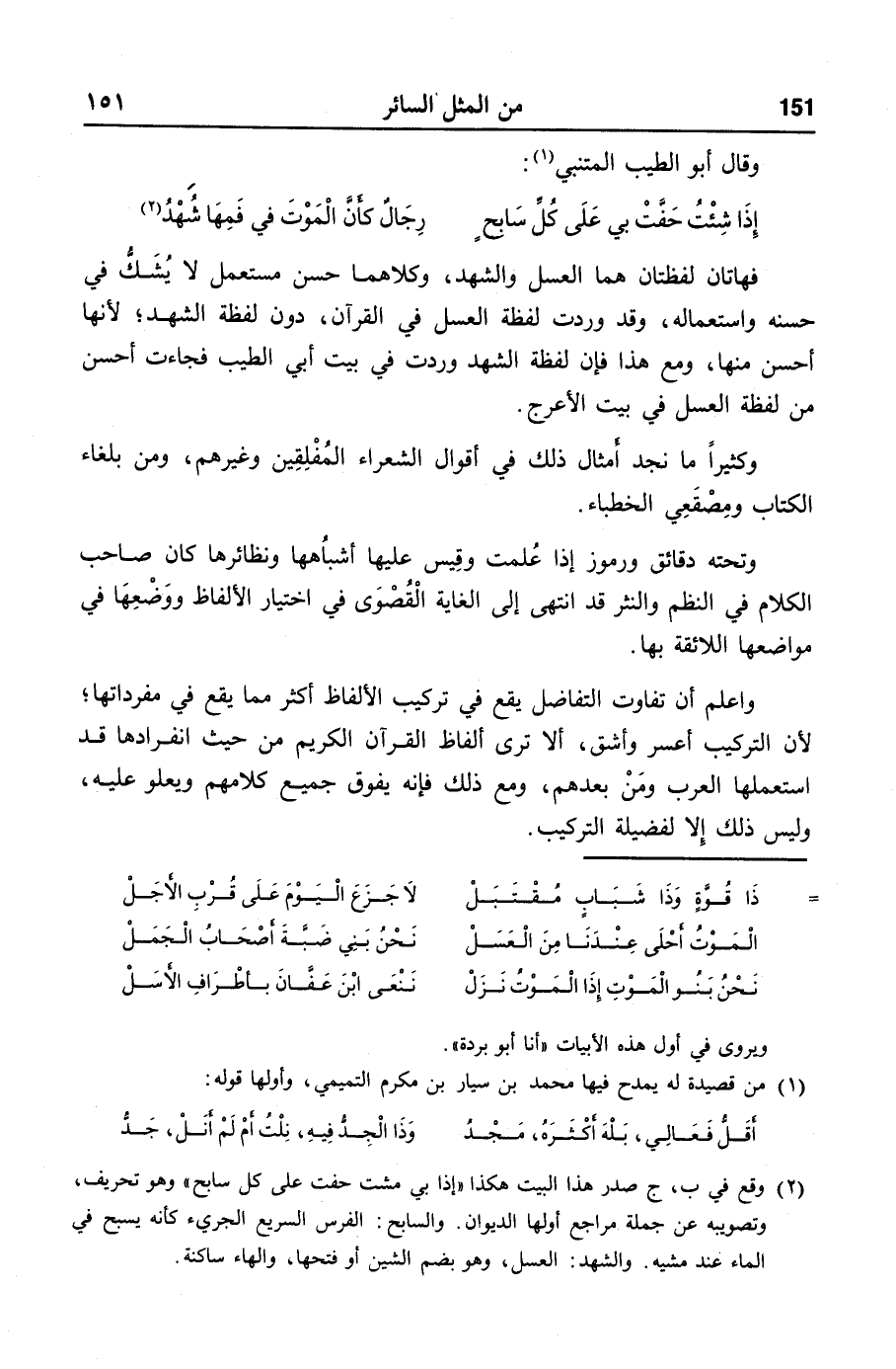 فهاتان لفظتان هما العسل والشهد، وكلاهما حسن مستعمل لا يشكّ في حسنه واستعماله، وقد وردت لفظة العسل في القرآن، دون لفظة الشهد؛ لأنها أحسن منها، ومع هذا فإن لفظة الشهد وردت في بيت أبي الطيب فجاءت أحسن من لفظة العسل في بيت الأعرج.