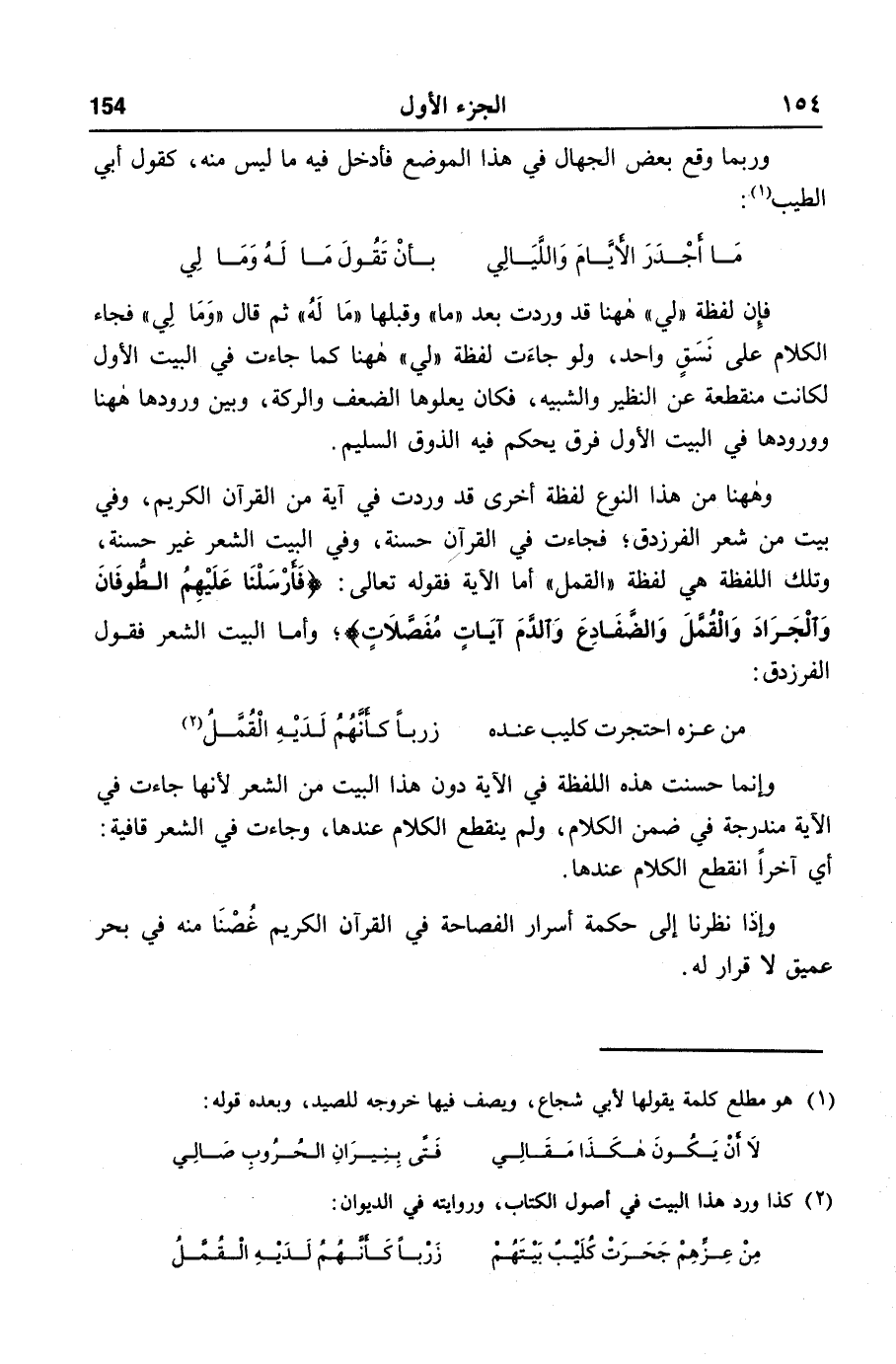 فإن لفظة «لي» ههنا قد وردت بعد «ما» وقبلها «ما له» ثم قال «وما لي» فجاء الكلام على نسق واحد، ولو جاءت لفظة «لي» ههنا كما جاءت في البيت الأول لكانت منقطعة عن النظير والشبيه، فكان يعلوها الضعف والركة، وبين ورودها ههنا وورودها في البيت الأول فرق يحكم فيه الذوق السليم.