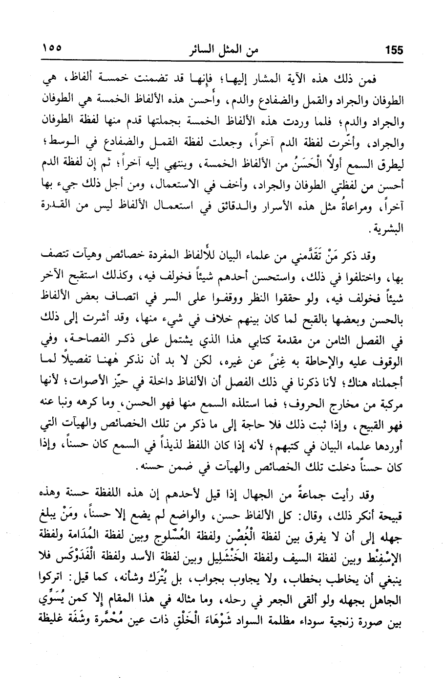 وقد ذكر من تقدّمني من علماء البيان للألفاظ المفردة خصائص وهيآت تتصف بها، واختلفوا في ذلك، واستحسن أحدهم شيئا فخولف فيه، وكذلك استقبح الآخر شيئا فخولف فيه، ولو حققوا النظر ووقفوا على السر في اتصاف بعض الألفاظ بالحسن وبعضها بالقبح لما كان بينهم خلاف في شيء منها، وقد أشرت إلى ذلك في الفصل الثامن من مقدمة كتابي هذا الذي يشتمل على ذكر الفصاحة، وفي الوقوف عليه والإحاطة به غنى عن غيره، لكن لا بد أن نذكر ههنا تفصيلا لما أجملناه هناك؛ لأنا ذكرنا في ذلك الفصل أن الألفاظ داخلة في حيّز الأصوات؛ لأنّها مركبة من مخارج الحروف؛ فما استلذه السمع منها فهو الحسن، وما كرهه ونبا عنه فهو القبيح، وإذا ثبت ذلك فلا حاجة إلى ما ذكر من تلك الخصائص والهيآت التي أوردها علماء البيان في كتبهم؛ لأنه إذا كان اللفظ لذيذا في السمع كان حسنا، وإذا كان حسنا دخلت تلك الخصائص والهيآت في ضمن حسنه.