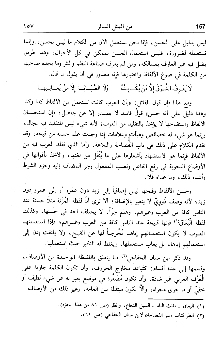 ومع هذا فإن قول القائل: «بأن العرب كانت تستعمل من الألفاظ كذا وكذا وهذا دليل على أنه حسن» قول فاسد لا يصدر إلا عن جاهل؛ فإن استحسان الألفاظ واستقباحها لا يؤخذ بالتقليد من العرب؛ لأنه شيء ليس للتقليد فيه مجال، وإنما هو شيء له خصائص وهيآت وعلامات إذا وجدت علم حسنه من قبحه، وقد تقدم الكلام على ذلك في باب الفصاحة والبلاغة، وأما الذي نقلد العرب فيه من الألفاظ فإنما هو الاستشهاد بأشعارها على ما ينقل من لغتها، والأخذ بأقوالها في الأوضاع النحوية في رفع الفاعل ونصب المفعول وجر المضاف إليه وجزم الشرط وأشباه ذلك، وما عداه فلا.