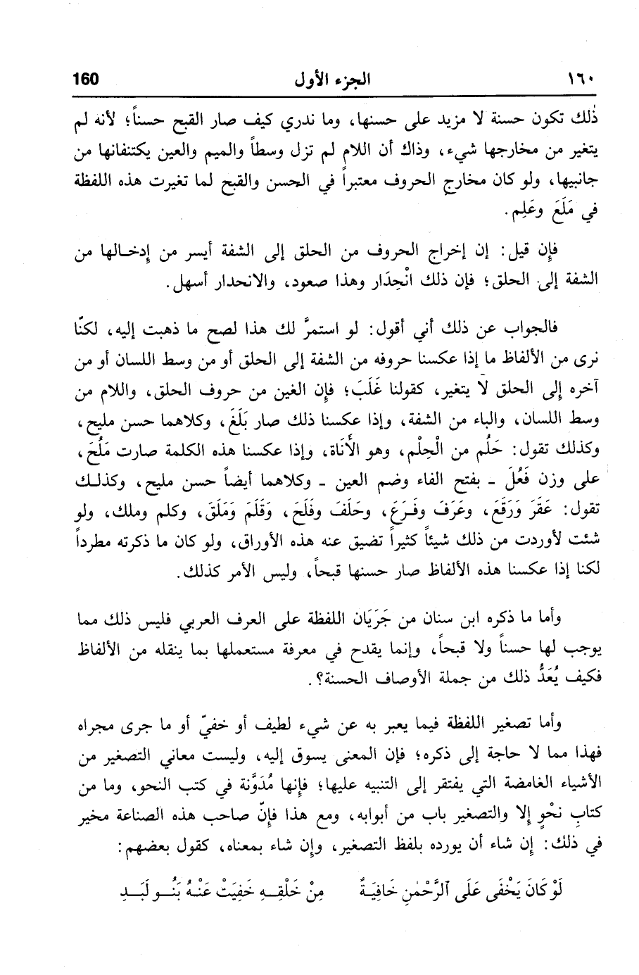 فالجواب عن ذلك أني أقول: لو استمرّ لك هذا لصح ما ذهبت إليه، لكنّا نرى من الألفاظ ما إذا عكسنا حروفه من الشفة إلى الحلق أو من وسط اللسان أو من آخره إلى الحلق لا يتغير، كقولنا غلب؛ فإن الغين من حروف الحلق، واللام من وسط اللسان، والباء من الشفة، وإذا عكسنا ذلك صار بلغ، وكلاهما حسن مليح، وكذلك تقول: حلم من الحلم، وهو الأناة، وإذا عكسنا هذه الكلمة صارت ملح، على وزن فعل- بفتح الفاء وضم العين- وكلاهما أيضا حسن مليح، وكذلك تقول: عقر ورقع، وعرف وفرع، وحلف وفلح، وقلم وملق، وكلم وملك، ولو شئت لأوردت من ذلك شيئا كثيرا تضيق عنه هذه الأوراق، ولو كان ما ذكرته مطردا لكنا إذا عكسنا هذه الألفاظ صار حسنها قبحا، وليس الأمر كذلك.